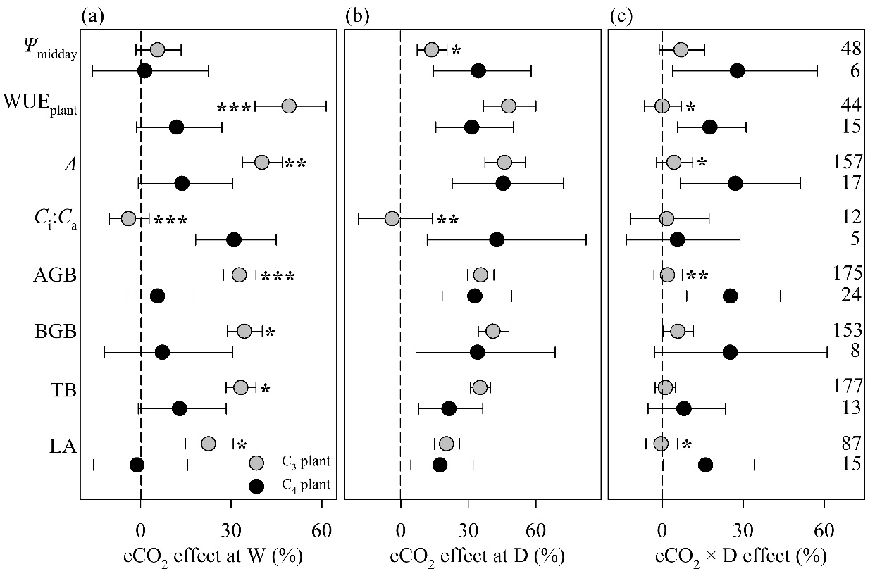 研究结果显示,在发生干旱时,CO2浓度升高可以降低植物气孔导度、减少蒸腾失水、增大植物根冠比、提高水分吸收能力,进而改善植物的水分状况,降低干旱对植物光合作用的气孔限制。因此,在干旱环境中CO2浓度升高对光合作用的促进作用更显著。叶片水平的水分利用效率随CO2浓度升高成比例升高,但植株水平的水分利用效率对CO2浓度升高的响应较弱。此外,CO2浓度升高和干旱的交互作用对植物的效应也受到光合作用途径、植物功能型等因素的影响:CO2浓度升高对C3植物光合作用和生物量生产的正效应不随环境水分状况而改变,但对C4植物的正效应随土壤水分有效性的降低而增大;两者交互作用对木本植物和草本植物的效应没有显著差别。本研究在全球变化背景下的植物生长和植被碳汇潜力估测和预测、气候变化应对和生态系统“碳中和”实践中有重要意义。