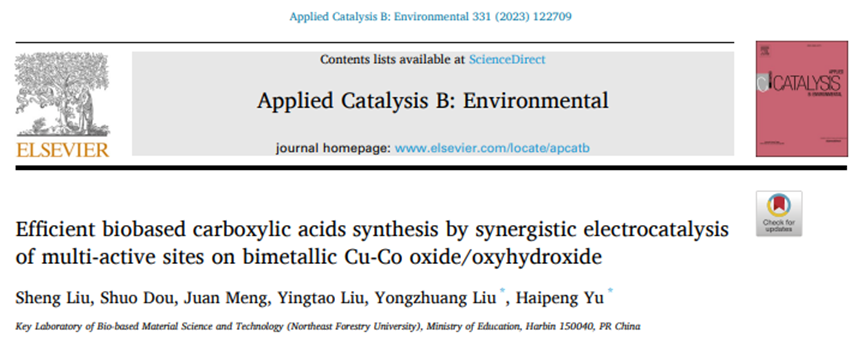 近日,我校生物质材料科学与技术教育部重点实验室刘永壮副教授课题组在国际著名期刊Applied Catalysis B: Environmental(一区TOP期刊,IF=24.32)上在线发表题为“Efficient biobased carboxylic acids synthesis by synergistic electrocatalysis of multi-active sites on bimetallic Cu-Co oxide/oxyhydroxide”的研究论文。该研究通过制备低成本和高活性的双金属过渡金属基电催化剂,实现了多种生物基羧酸的高效制备,提供了一种串联林木生物质精炼和电催化增值的林木资源高附加值利用新思路。