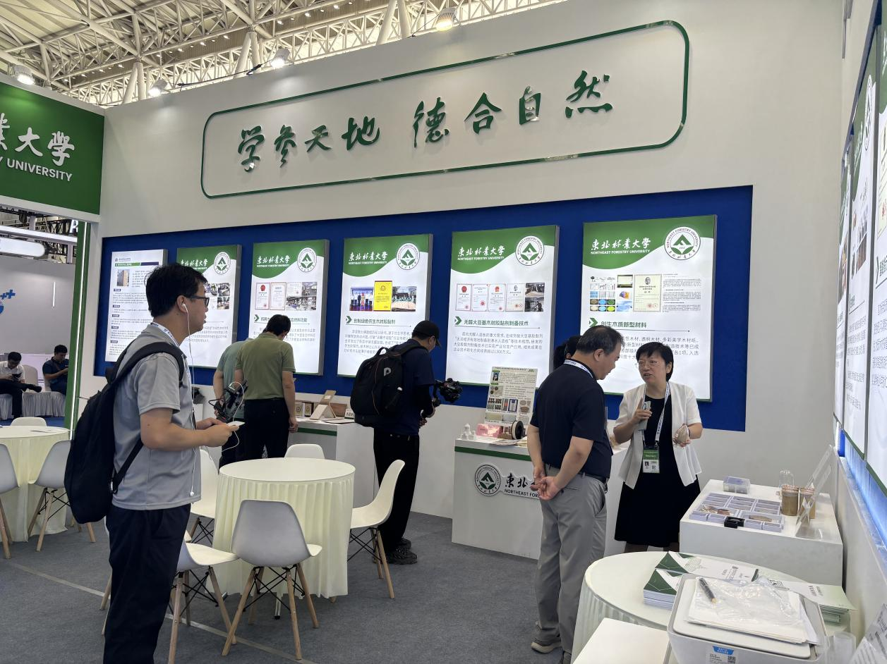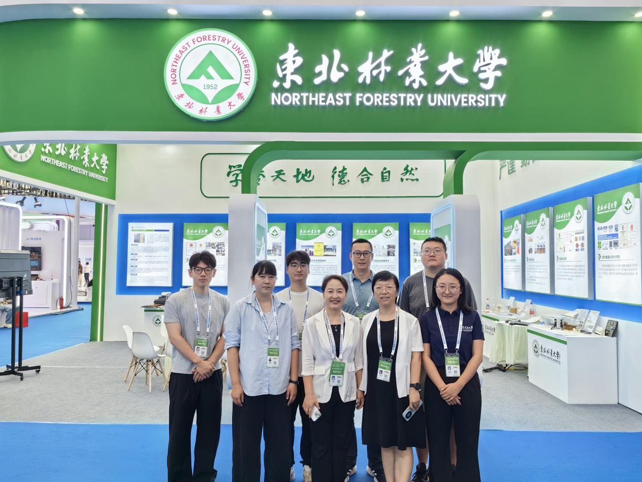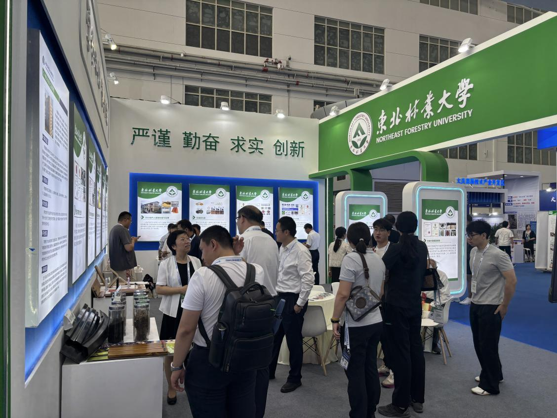 学校本次展出速生材材质优化技术、木质纤维-塑料复合材料、绿色仿生木材胶黏剂、无醛大豆基木材胶黏剂制备技术、木质新型材料、生物质光肥、智能指示膜、林木酚组分发光材料、基于深度学习的木材染色计算机智能配色系统、基于机器学习的纤维增强复合材料汽车零部件设计等近20件科技成果,同时精心准备了具有鲜明“绿色、环保”特色的科技成果实物展品,吸引了众多行业内的参展观众,展示了学校在生物质新材料领域的深厚积淀和技术实力。这些展示在新博会上从实验室走向产业一线的环保“黑科技”,不仅是学校扎根龙江、服务绿色发展的生动体现,更展现了科技创新在破解生态难题、推动产业升级中的硬核力量。