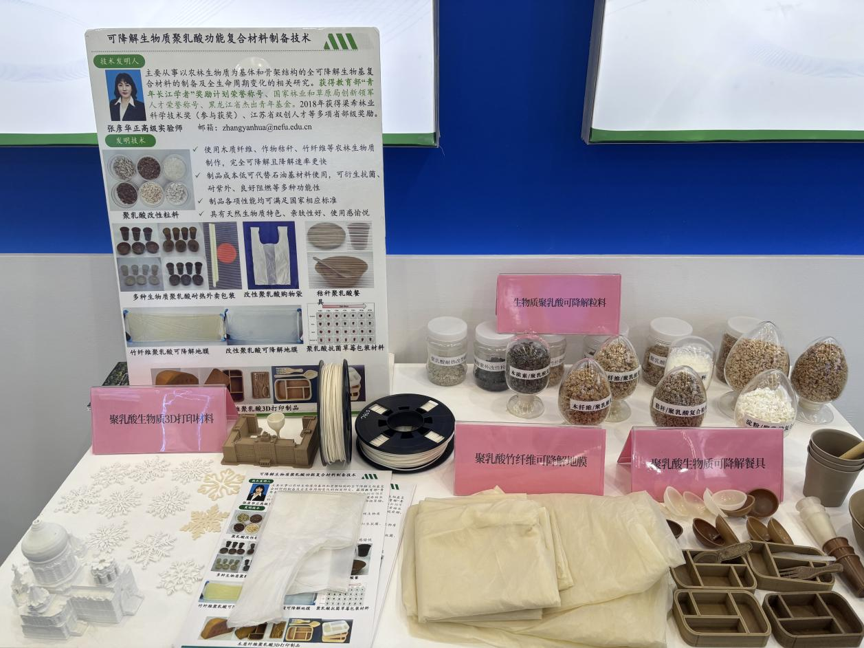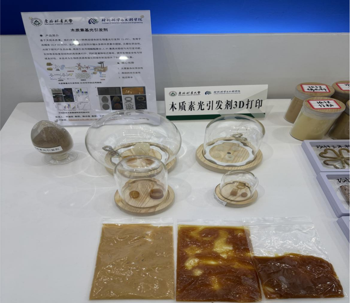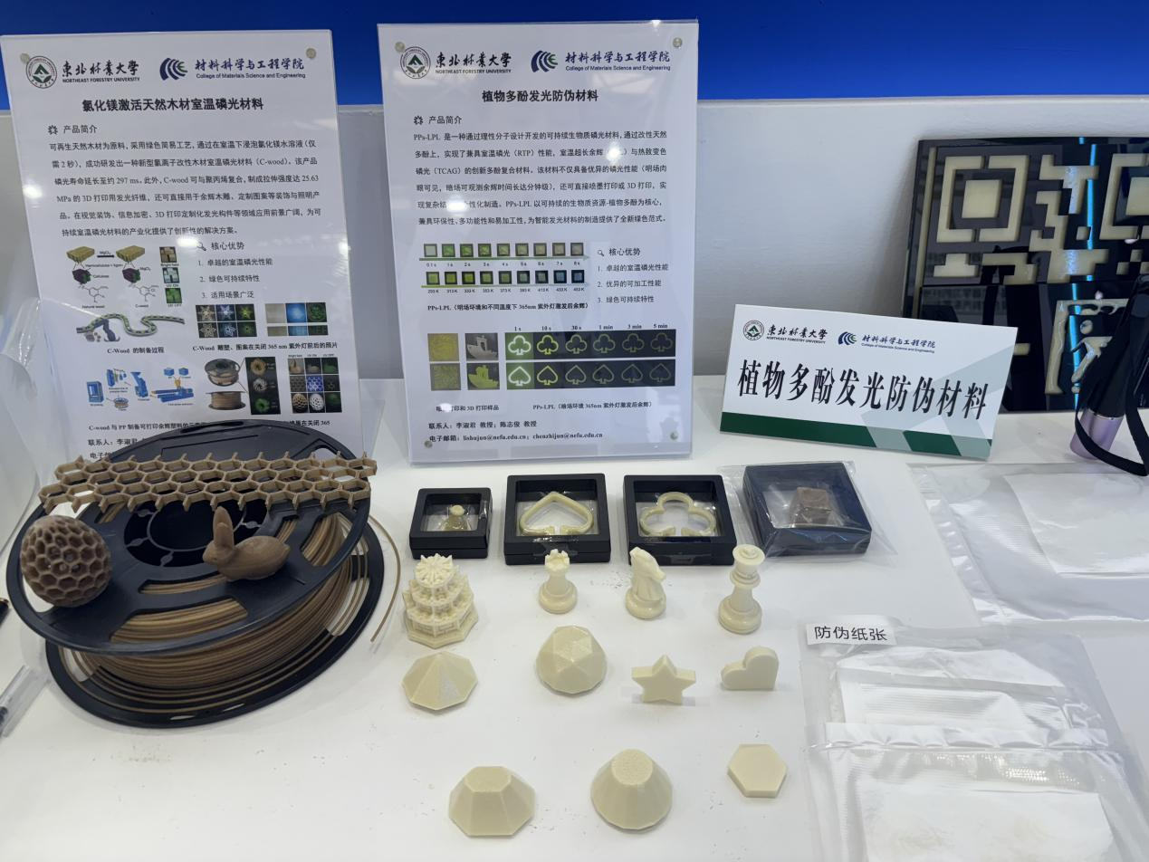 学校本次展出速生材材质优化技术、木质纤维-塑料复合材料、绿色仿生木材胶黏剂、无醛大豆基木材胶黏剂制备技术、木质新型材料、生物质光肥、智能指示膜、林木酚组分发光材料、基于深度学习的木材染色计算机智能配色系统、基于机器学习的纤维增强复合材料汽车零部件设计等近20件科技成果,同时精心准备了具有鲜明“绿色、环保”特色的科技成果实物展品,吸引了众多行业内的参展观众,展示了学校在生物质新材料领域的深厚积淀和技术实力。这些展示在新博会上从实验室走向产业一线的环保“黑科技”,不仅是学校扎根龙江、服务绿色发展的生动体现,更展现了科技创新在破解生态难题、推动产业升级中的硬核力量。