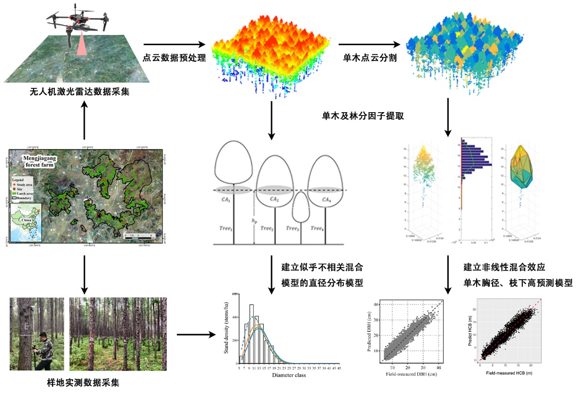 直径分布是反映森林历史干扰和未来长势的重要结构特征,也是评估林分经济利用价值和经济效益的重要依据。受限于单木遥感探测方法的不确定性,团队从林分结构视角出发,运用无人机遥感平台搭载激光雷达传感器,获取林分水平下激光雷达特征因子模拟长白落叶松人工林直径分布。研究构建了含有混合效应的似乎不相关模型,通过相对易测的林分密度指标对模型进行局部校准,提升了模型的预测效果和在不同区域应用的可移植能力。此项研究是该团队使用无人机激光雷达遥感手段继预测单木直径后的又一突破,为实现碳中和目标形势下了解和掌握森林空间结构信息迈进了扎实一步。