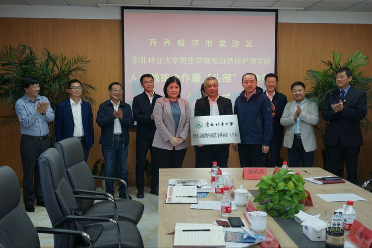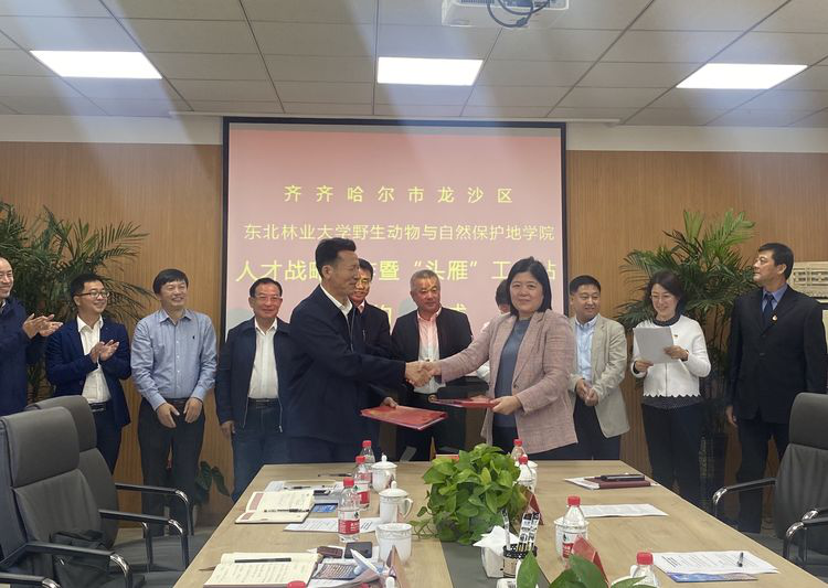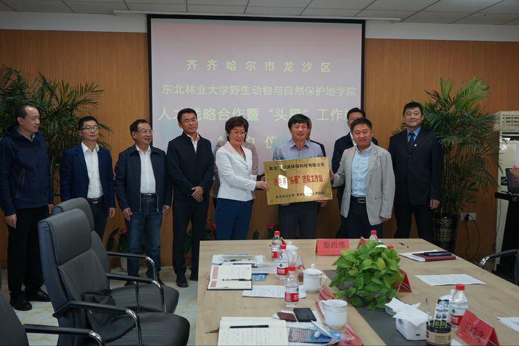 9月20日上午,我校野生动物与自然保护地学院与齐齐哈尔市龙沙区人才战略合作暨“头雁”工作站签约仪式在黑龙江睿涛环保科技有限公司举行。此项合作是动保学院全面发挥人才、团队和学科优势,助力地方发展和科技成果转化的重要举措。这标志着我校实施校、地、企三方合作机制的进一步深化,对促进我校科研成果转化,推动人才工作站纵深发展,提升地方和企业创新绩效有着重要意义。