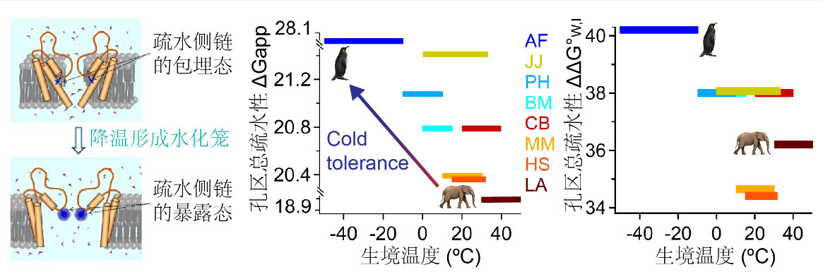 图2. TRPM8孔区疏水性决定暴露态水化笼的稳定性,进而影响其低温激活;不同脊椎动物TRPM8孔区疏水性与生境温度适应的关系。