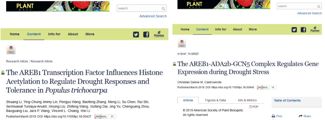 同期,Plant Cell杂志发表了题为“The AREB1 Transcription Factor Influences Histone Acetylation to Regulate Drought Responses and Tolerance inPopulus trichocarpa”的研究论文。该研究揭示了转录因子与组蛋白修饰协同调控杨树适应干旱胁迫的新机制,为利用分子技术进行林木抗逆育种开拓了新思路。这一研究成果被Plant Cell杂志专门撰写论文进行评述,认为该项研究为表观遗传调控在植物应答干旱胁迫中的作用提供了新的见解(Castroverde 2019, Plant Cell, 31: 559-560)。