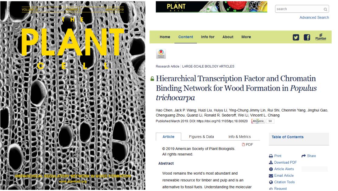 2019年3月,Plant Cell杂志第31期发表了题为“Hierarchical Transcription Factor and Chromatin Binding Network for Wood Formation inPopulus trichocarpa”的研究论文。该研究为提高森林生产力提供了一条崭新且精确的遗传改良途径,该论文被选为该月期刊封面文章。