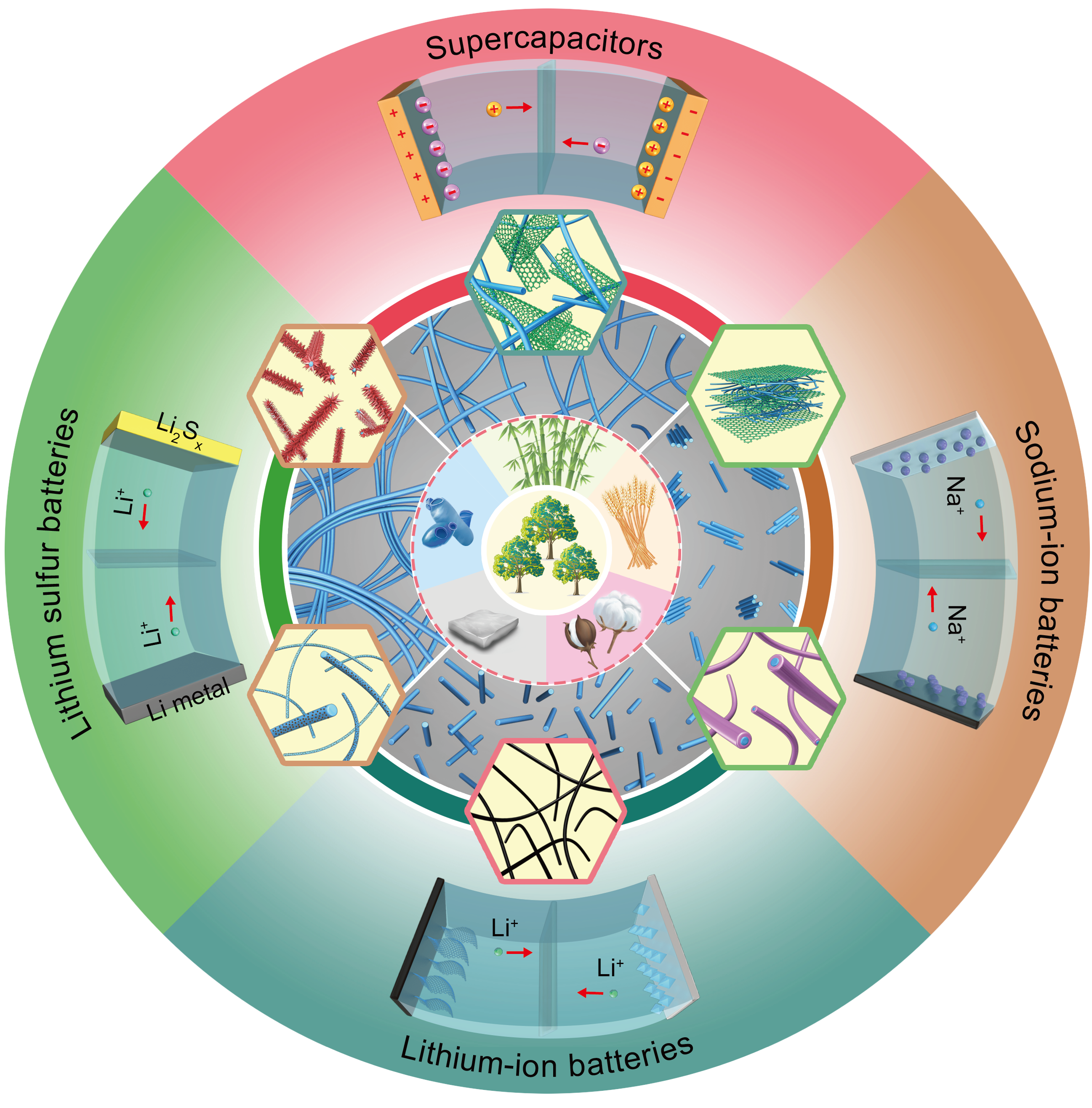 文章主题围绕近年来材料科学领域新兴的一种可持续纳米材料——纳米纤维素展开。这一材料主要源于木材、竹材、农作物秸秆等可再生资源,是支撑树木的最基本构筑单元,具有高结晶度、高强度、高比表面积等优点,近年来已在能量储存领域得到广泛关注。该项工作结合合作团队的研究进展,从树木等林业资源的纤维素纳米结构、不同结构与表面化学性能的纳米纤维素的制备策略、纳米纤维素及其衍生材料在超级电容器、锂离子电池等能量储存领域中的研究现状等角度进行了系统的综述与评论。该文对深入理解纳米纤维素在能量储存领域中的应用潜力有着重要的理论参考价值。