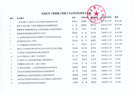 2017年“全国化学工程领域工程硕士专业学位优秀论文”名单揭晓,我校理学院陈立钢老师指导的2014届硕士研究生朴春颖同学的学位论文榜上有名。