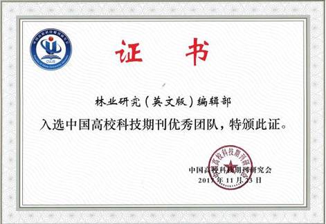 中国高校科技期刊研究会在建会30周年之际,开展了2017年中国高校科技期刊“优秀团队及优秀个人”评选活动。《林业研究》(英文版)编辑部被评为“2017年中国高校科技期刊优秀团队”,编辑部主任于雷副编审入选2017年“中国高校科技期刊优秀青年编辑”,朱虹副编审入选2017年“中国高校科技期刊优秀编辑”。另外,《林业研究》(英文版)网站还荣获了“2017年第四届中国高校科技期刊优秀网站奖”。