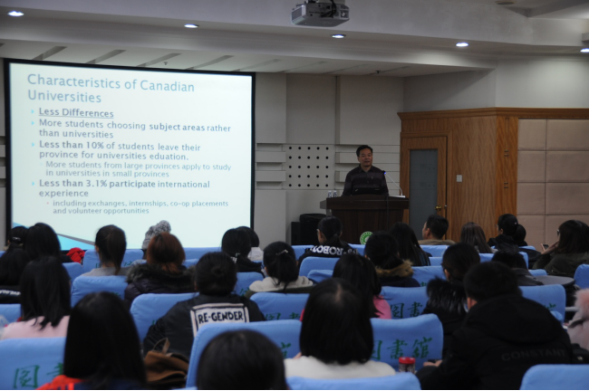 孟繁瑞教授从加拿大高等教育种类特点、教育趋势、留学加拿大的申请材料、申请流程及学费杂费等方面做了详细介绍。讲座过程中,孟教授讲述了加拿大高校目前的教育形式,以大量丰富真实的案例介绍了加拿大的留学特点,为我校有留学意向的学生提供了指导性的建议。