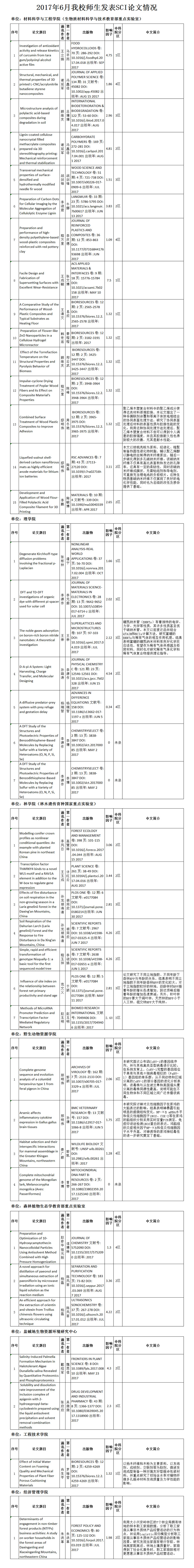 2017年6月,我校师生以“东北林业大学”为第一署名单位发表SCI论文40篇。其中材料科学与工程学院(生物质材料科学与技术教育部重点实验室)15篇、理学院7篇、林学院(林木遗传育种国家重点实验室)7篇。