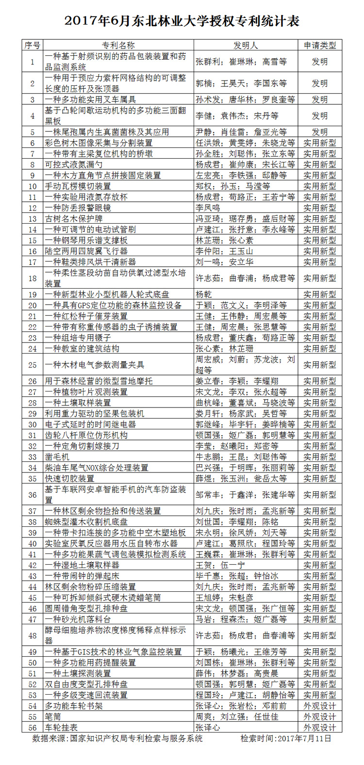 根据国家知识产权局专利检索与服务系统(www.pss_system.gov.cn)的统计数据,2017年6月,我校师生获得专利授权56项,其中发明授权5项,实用新型授权48项,外观设计授权3项。