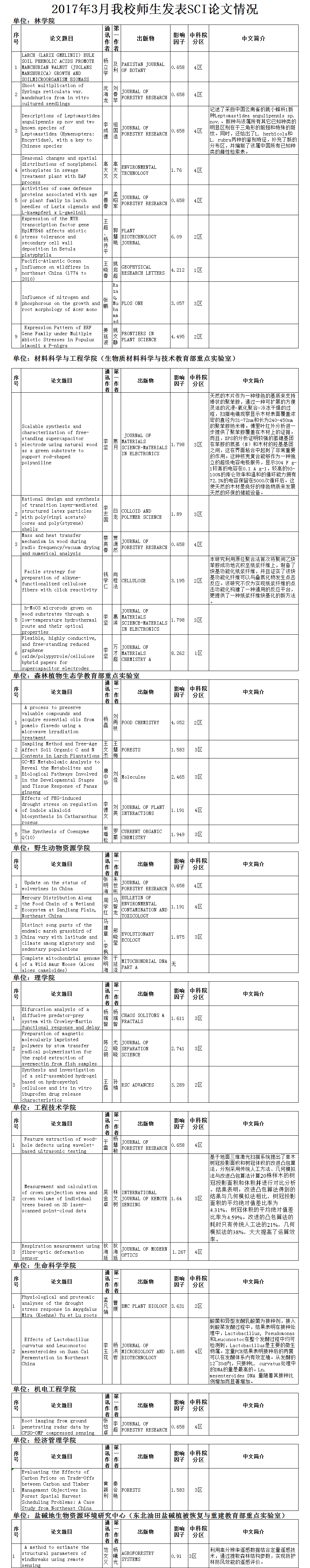 2017年3月,我校师生以“东北林业大学”为第一署名单位发表SCI论文35篇。其中林学院9篇、材料科学与工程学院(生物质材料科学与技术教育部重点实验室)6篇、森林生态教育部重点实验室5篇。
