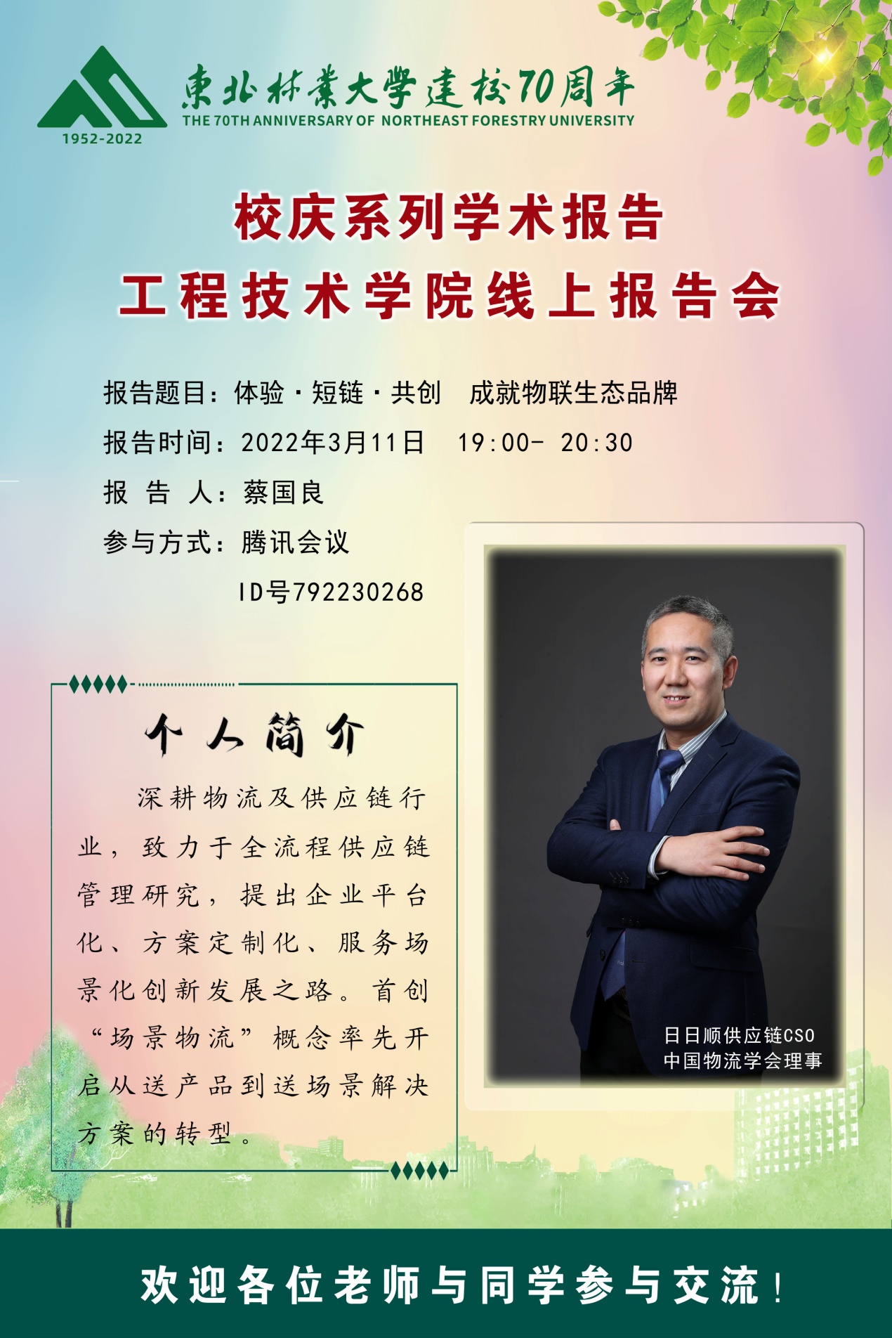 为迎接建校70周年华诞,学校组织东北林业大学70周年校庆系列学术报告活动,旨在总结学术成就,活跃学术氛围,彰显学者风采,激发创新热情,奏响学术强校最强音。