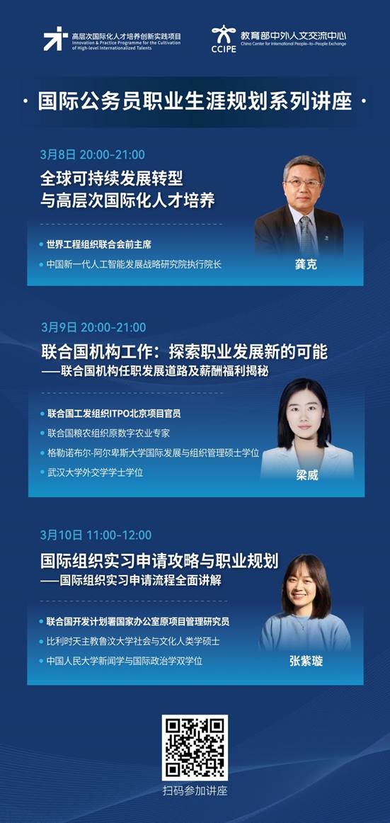我校于2021年3月正式获批教育部中外人文交流中心“高层次国际化人才培养创新实践项目”基地建设单位。旨在向国际组织培养并输送具有全球视野的高水平人才搭建国际化平台,为使同学们深入全面了解国际组织,将于3月8日-10日举行三场国际公务员职业生涯规划。