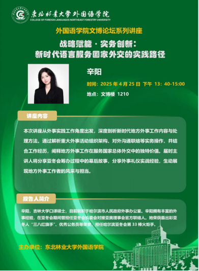 本次讲座从外事实践工作角度出发,深度剖析新时代地方外事工作内容与处理方法。通过解析重大外事活动组织架构、对外沟通联络等实务操作,并结合工作经历,阐释地方外事工作在服务国家总体外交中的独特价值。届时主讲人将分享亚冬会筹办过程中的幕后故事,分享外事礼仪实战经验,生动展现地方外事工作者的风采与担当。主题:战略赋能·实务创新:新时代语言服务国家外交的实践路径