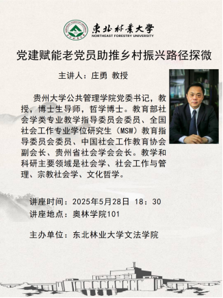 主讲人简介:庄勇,贵州大学公共管理学院党委书记,教授,博士生导师,哲学博士。教育部社会学类专业教学指导委员会委员、全国社会工作专业学位研究生(MSW)教育指导委员会委员、中国社会工作教育协会副会长、贵州省社会学会会长。教学和科研主要领域是社会学、社会工作与管理、宗教社会学、文化哲学。发表相关学术论文数十篇,出版学术专著两部、主编两部;主持国家社科基金项目二项,承担省部级以上社科课题十余项,获省社科优秀成果三等奖三项。2017年11月获民政部全国专业社会工作领军人才。