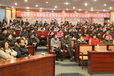 12月5日晚,由研究生会组织策划的“709院长论坛”第四十二期——“揭开在黑暗中的屠杀”在动资楼国际会议厅顺利举行。2002年感动中国人物、中国细菌战受害者诉讼原告团团长王选,侵华日军遗弃毒剂泄漏事件受害者代理律师、我校校友罗立娟,毒气弹受害者李臣先生做客“709院长论坛”,为师生解读日本在华细菌战调查和对日民间索赔工作,让听众了解历史真相。