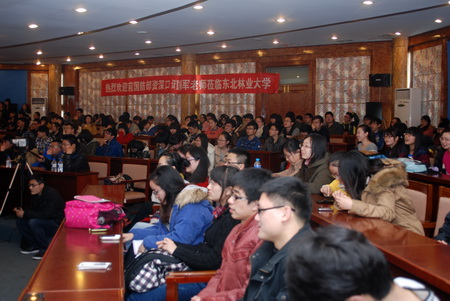 2013年4月18日16时,前国防部资深口译员杨军老师在东北林业大学国际会议厅为同学们带来了一场关于“翻译学习与人生际遇”的精彩讲座。本次讲座由外国语学院院长王丹教授主持,英语系主任赵莉教授组织并出席了本次讲座。