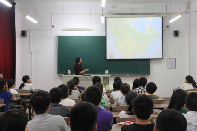 随后,孟教授为同学们讲述了加拿大生态研究的进展和森林经营的情况,介绍了当地的林区分布和地形特点。同时,孟教授也谈到了加拿大森林面对的严峻形势,改革后的采伐原则使加拿大形成了新生态格局,一些森林无法满足生物多样性针的需求,现在面临着稀有群落无法生存的现状。孟教授还利用图表的形式为同学们讲解了土壤养分和水分的对应关系,演示了省份平均光照图和温度分布图,并对如何预测哪个地方的何种树种更适合生长的问题进行了生动形象的解说。