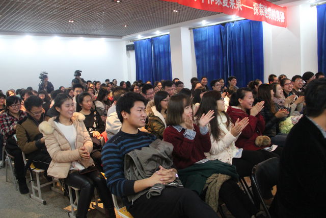 活动伊始,伴随着热烈的掌声,夏果果女士用诙谐幽默的语言介绍了自己,并谈及同学们对她在非诚勿扰和职来职往中“女神经”的印象,更让同学们感慨夏果果老师不拘小节、率真热情的个性。夏女士说:“以我们现在大多数人的努力程度,根本达不到拼天赋的地步。既然这就是现实,为何不活在当下,只要有一个人认可喜欢我,我就要努力的活着,即使没有,我还有我自己!”