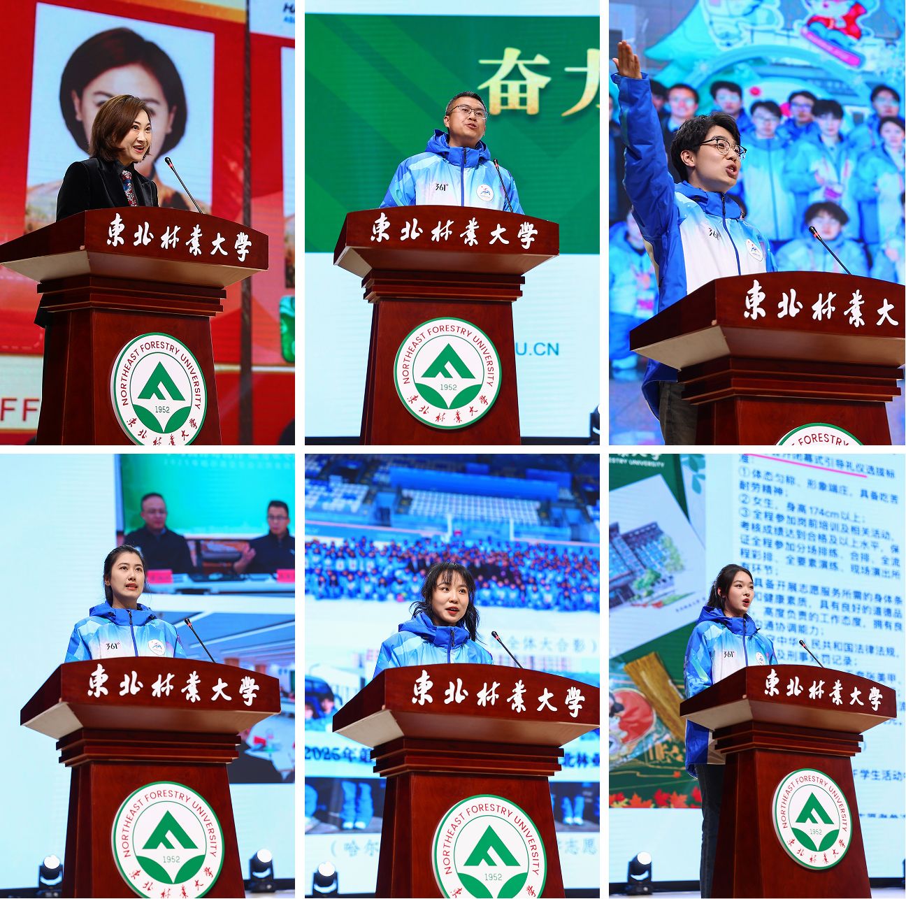外国语学院教师王宇、园林学院团委书记姚亮亮、经济管理学院辅导员解盛帅、生命科学学院博士研究生姜雅轩、家居与艺术设计学院硕士研究生刘顺凤、文法学院本科生蔡梓琪代表宣讲团作首场宣讲报告,6位师生从不同视角为大家生动分享了自己在亚冬会期间的专属回忆,讲出了“小绿叶”们拼搏奋斗的故事。志愿者们现场情景朗诵《“小绿叶”的亚冬记忆》,用真挚的情感表达了他们对这段经历的珍视与感悟。