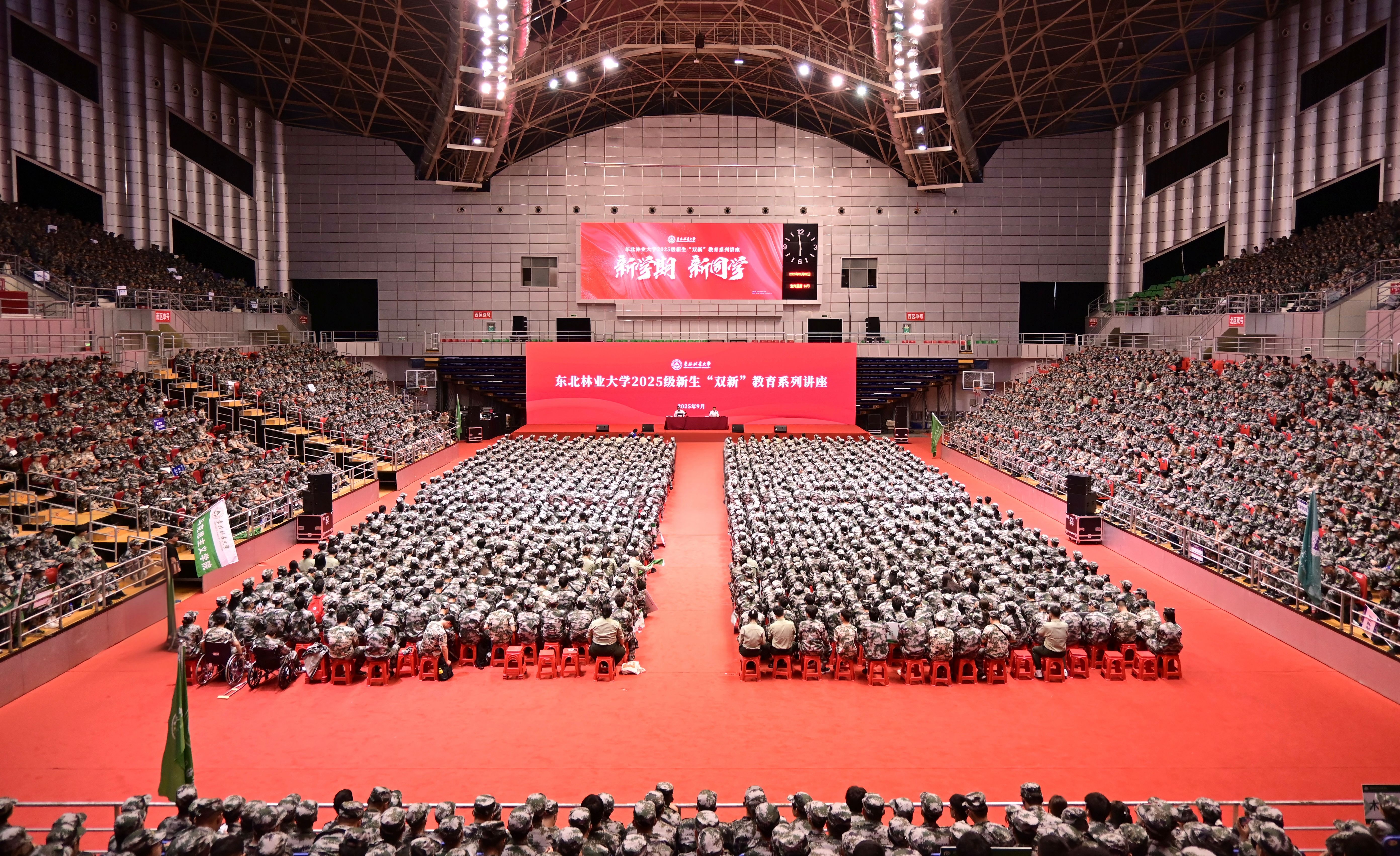 9月2日晚,按照学校“双新”教育日程安排,学校党委书记孙猛为全体2025级新同学讲授“开学第一课”。5000余名本科生新生、党委学工部、团委相关工作人员、各学院党委副书记在体育馆参加学习,3000余名研究生新生在线上分会场聆听报告,共同感受来自东林师长的殷殷嘱托和深切关怀。学校党委常委、副校长张春雷主持报告。