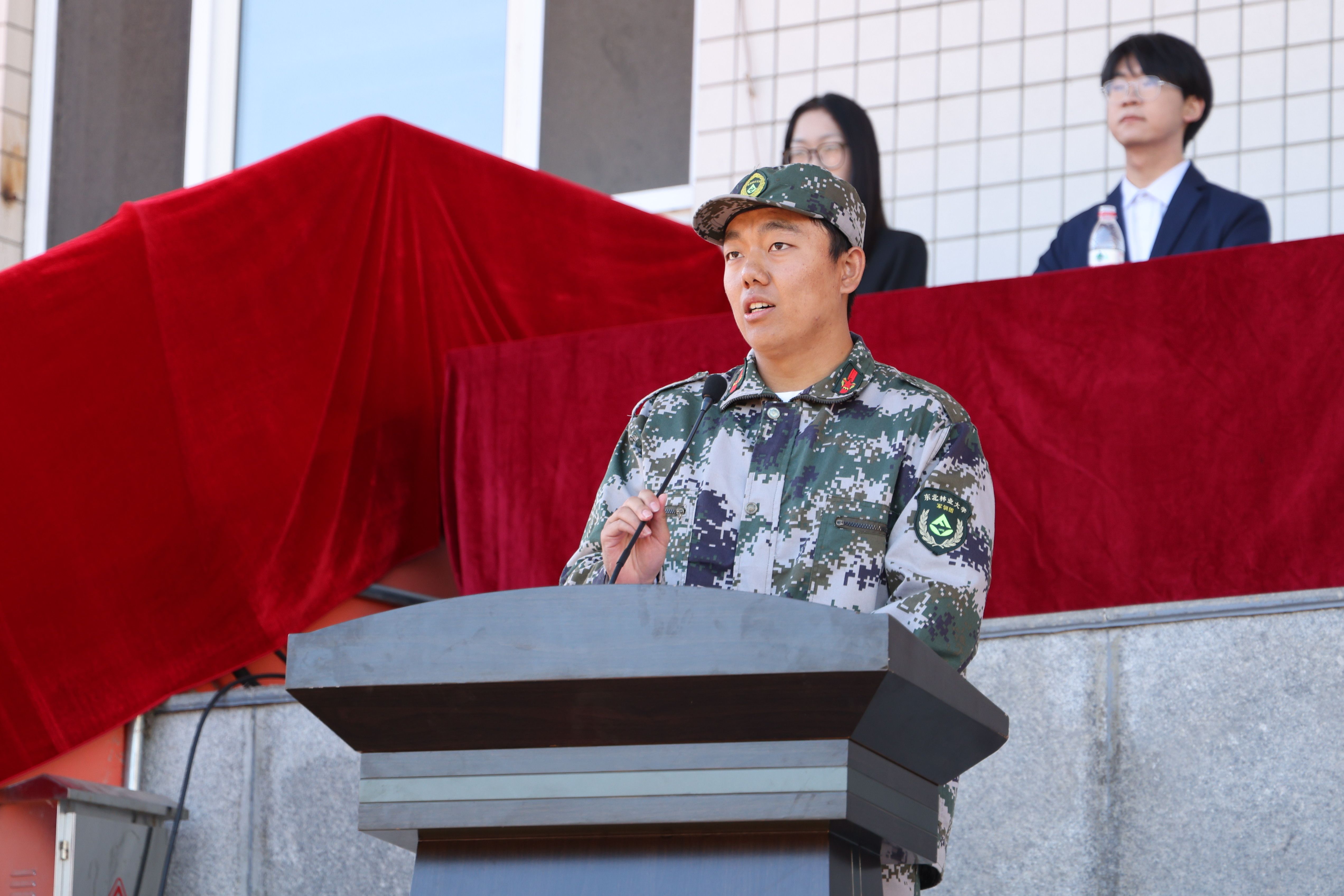 经济管理学院经济学类3班渠学岩同学与承训部队带队干部分别代表全体参训学生和教官发言。学校党委常委、副校长、军训团团长李明泽代表全校向承训部队赠送锦旗。