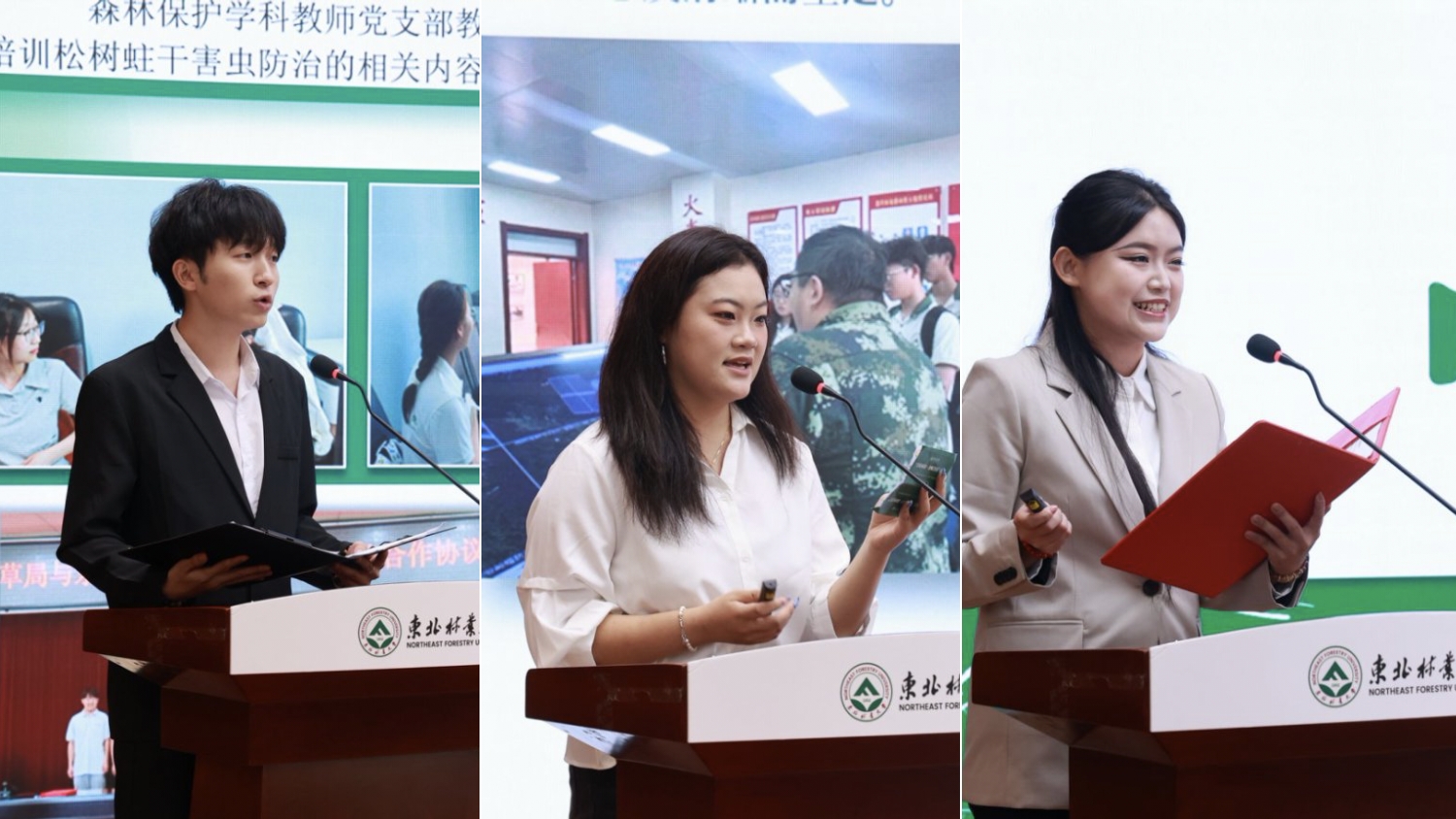 社会实践成果分享环节,三名学生代表先后分享了他们在绥化、大兴安岭以及齐齐哈尔等地林区的实践故事。
