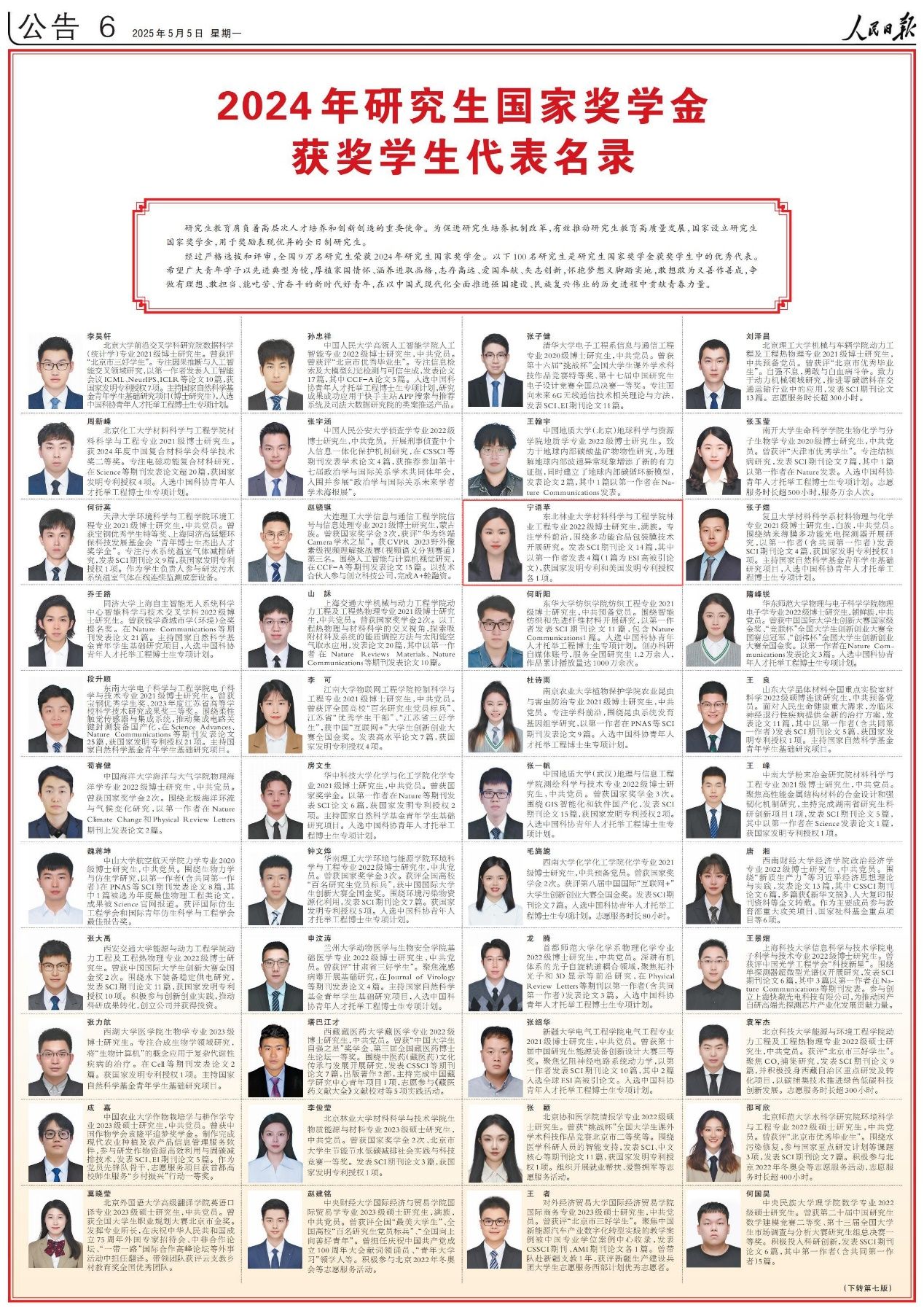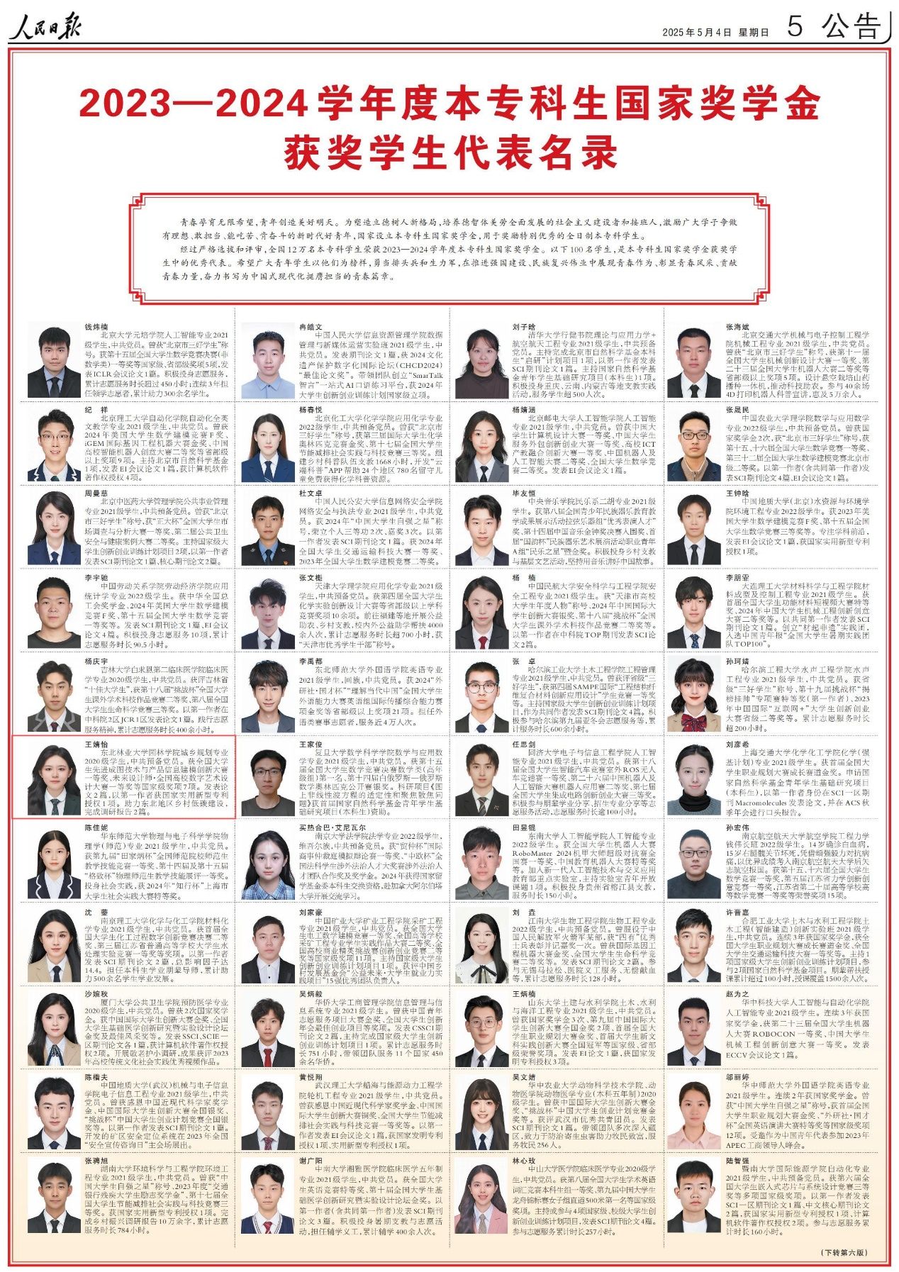 5月4日、5日,《人民日报》专版分别刊登了《2023—2024学年度本专科生国家奖学金获奖学生代表名录》《2024年研究生国家奖学金获奖学生代表名录》。我校园林学院2020级城乡规划专业本科生王婧怡和材料科学与工程学院2022级林业工程专业博士研究生宁语苹两名同学凭借优异表现成功入选,在这份极具分量的名录中崭露头角。