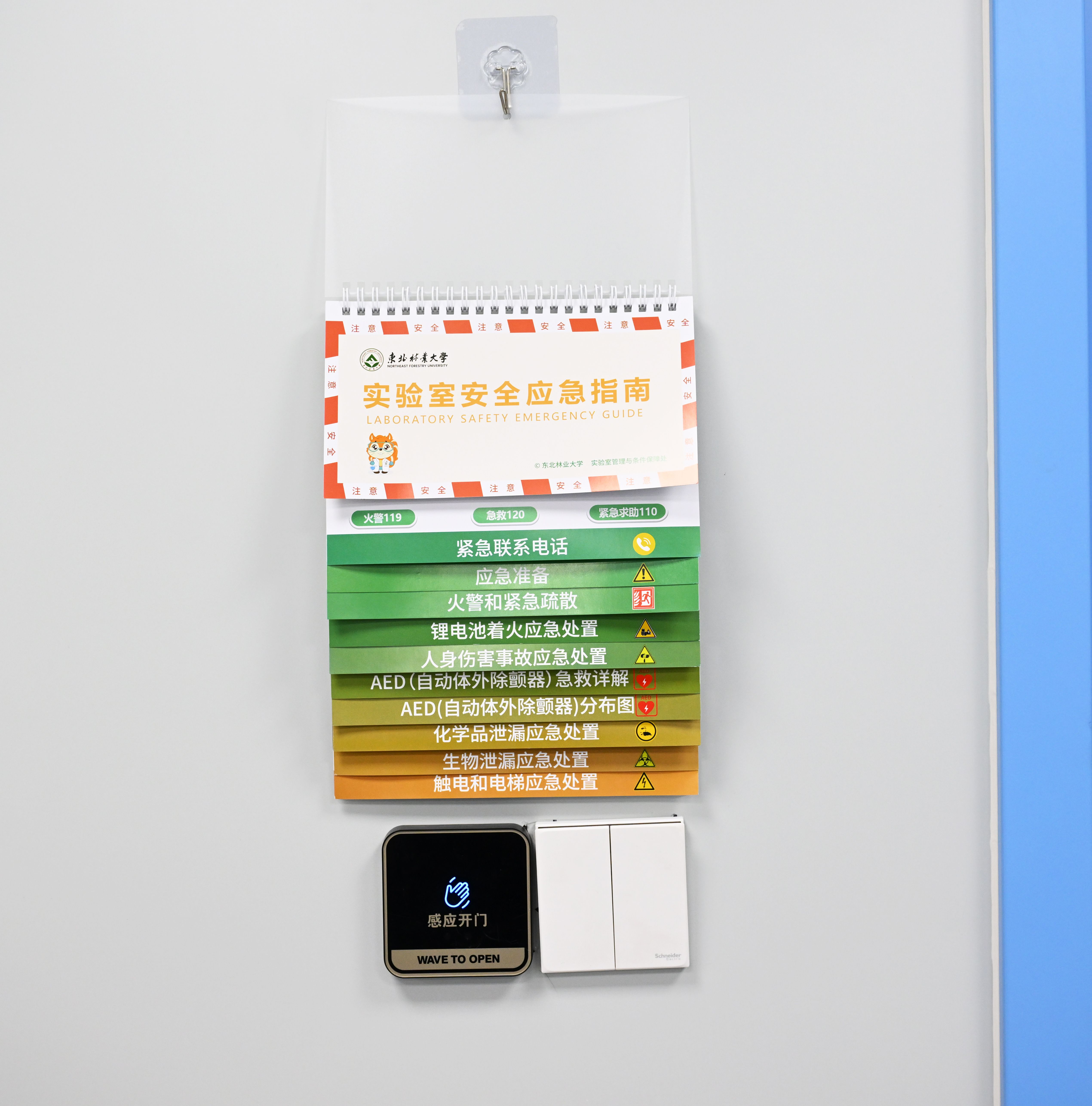 记者在实验室现场看到,这份“攻略”被挂在实验室门旁边的显著位置,只有不到A4纸的大小。其中包括火警和紧急疏散、锂电池着火应急处置、人身伤害事故应急处置、化学品泄漏现场应急处置、AED(自动体外除颤器)急救详解、AED(自动体外除颤器)分布图、生物泄漏应急处置、触电和电梯应急处置等专项页面。而且安全应急指南设计巧妙,每个专项页面长度不同,各专项名称统一放在页面底端,所有项目都可以一目了然地显示出来,方便师生遇到紧急情况时迅速翻取。