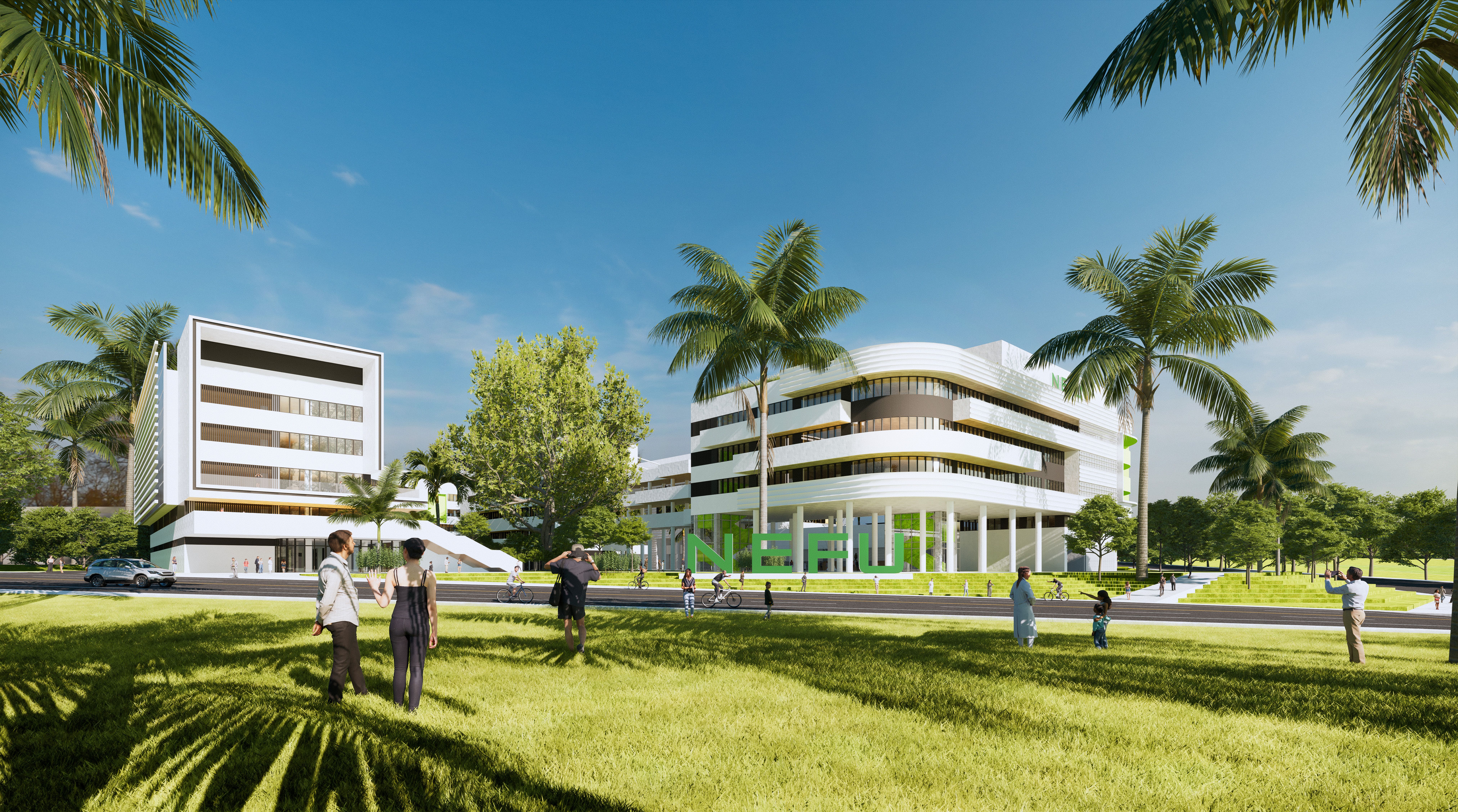 项目选址在海南陵水黎安国际教育创新试验区的百年古树附近,其设计理念深度契合东林“学参天地,德合自然”的校训精神,功能布局全面贴合东林在海南就读师生的专业教学、实验研究、学术研讨与国际交流等核心需求。项目由教学楼、科研楼、国际联合研究中心三座单体建筑组成。其中,教学楼集专业教学、研讨讲座、交流活动、行政办公、国际交流及学术会议等功能于一体;科研楼设有计算机科学与技术实验区、机械工程试验区、生物与先进材料试验区、土木工程实验室等多个专业实验空间,配备各类高标准实验室、实验用房及相关学科研究中心;国际联合研究中心则为中外合作办学量身打造多样化科研空间,可根据使用场景灵活调整,为联合办学、学术研讨、工作营、工作室等活动提供坚实的空间支撑。