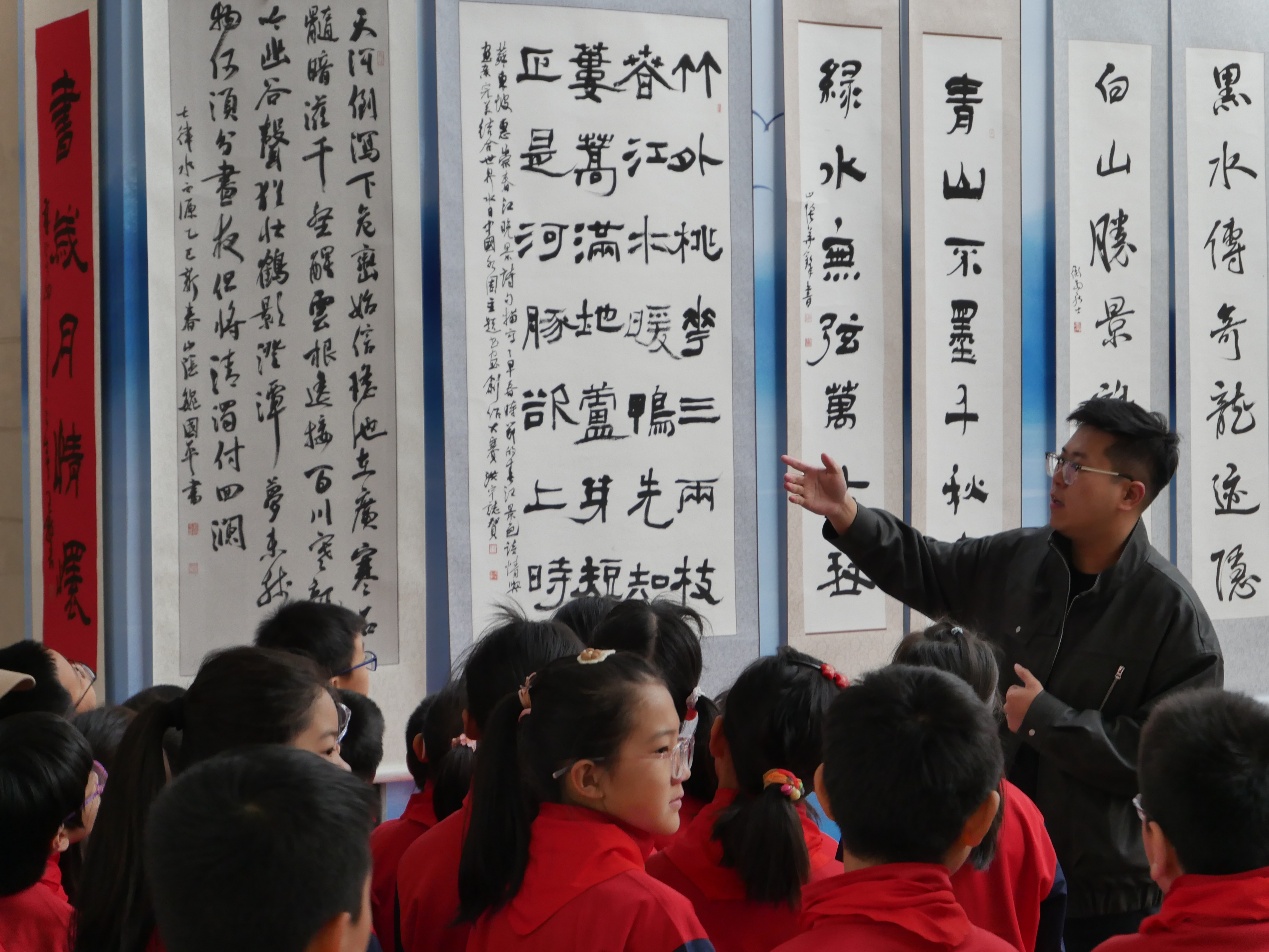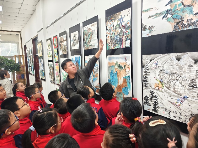 工农兵小学校长郭萌带领50名师生参观了由我校后勤保障部筹办的“感江河大爱 书岁月情怀—2025年‘世界水日中国水周’主题书法绘画创作大赛优秀作品展”。东北林业大学书画协会的同学们详细讲解每一幅作品背后的故事和寓意,让孩子们在艺术的氛围中感受生态文明的魅力,不仅展示了参赛选手的艺术才华,也通过作品向孩子们传递了对大自然的敬畏与热爱。