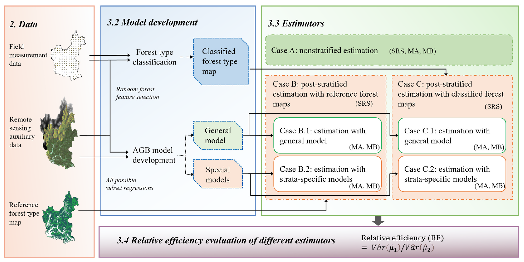 第二项研究进一步拓展至区域尺度,聚焦森林类型分层抽样在生物量估算中的应用效能。通过构建多种分层对比框架,研究揭示了遥感分类产品用于分层时易累积多重误差、显著增加估算偏差等关键问题,为优化森林资源调查分层策略、提升大尺度生物量估算可靠性提供了重要决策依据。