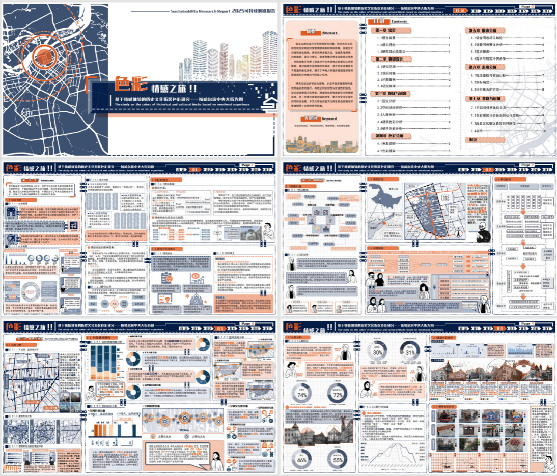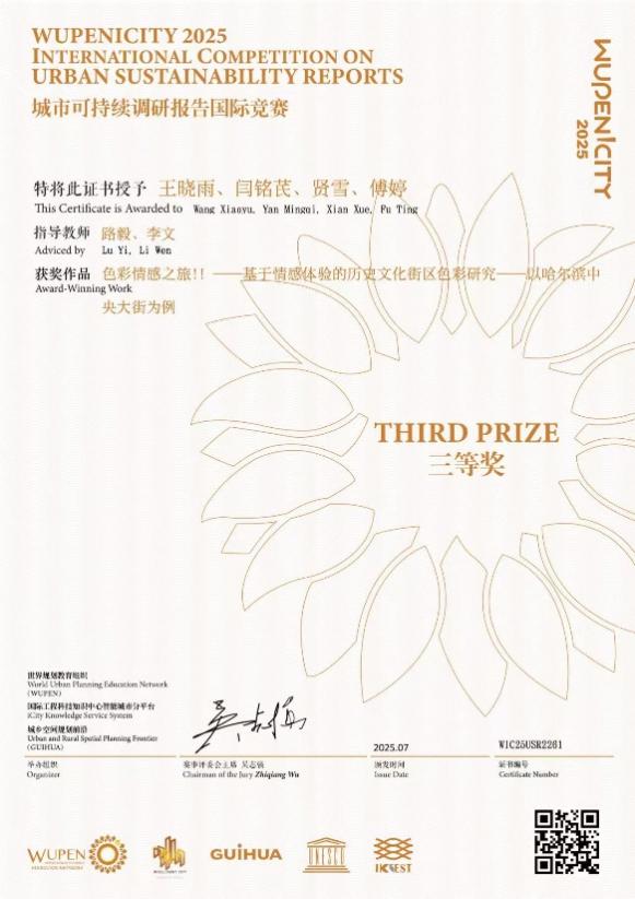 日前,2025年WUPENiCity城市可持续调研报告国际竞赛获奖名单正式揭晓。由园林学院风景园林专业学生王晓雨、闫铭芪、贤雪、傅婷共同完成,教师路毅、李文指导的作品《色彩情感之旅!!——基于情感体验的历史文化街区色彩研究--以哈尔滨中央大街为例》荣获调研报告类三等奖。