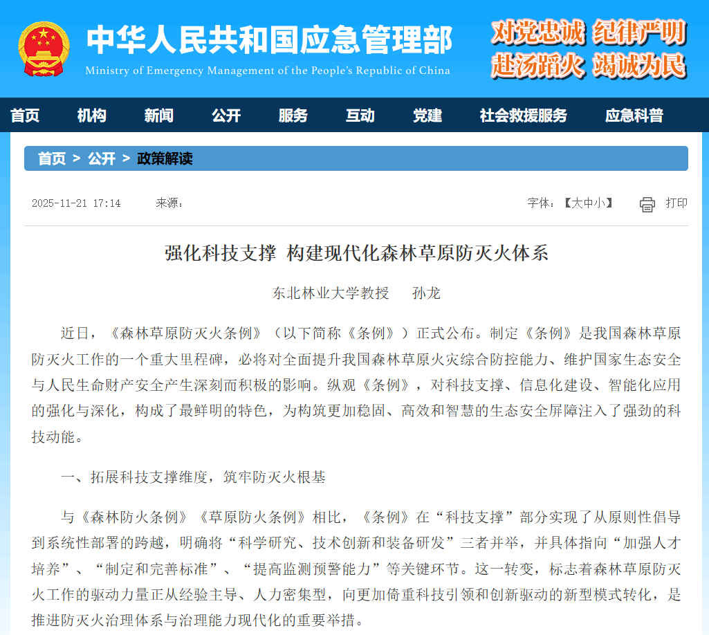 近日,国务院正式公布《森林草原防灭火条例》(以下简称《条例》),标志着我国森林草原火灾防控工作迈入法治化、科学化、现代化的新阶段。在此重要节点,我校林学院森林防火学科带头人孙龙教授,受邀在应急管理部官网发表专题评论文章《强化科技支撑 构建现代化森林草原防灭火体系》,以深厚的学科积淀与前沿研究视野,深度解码《条例》科技内核,引发业内广泛关注。