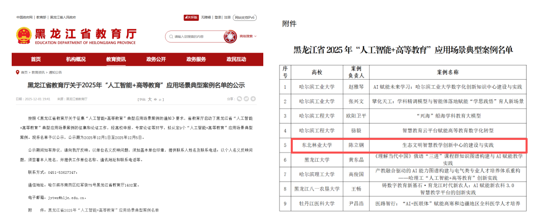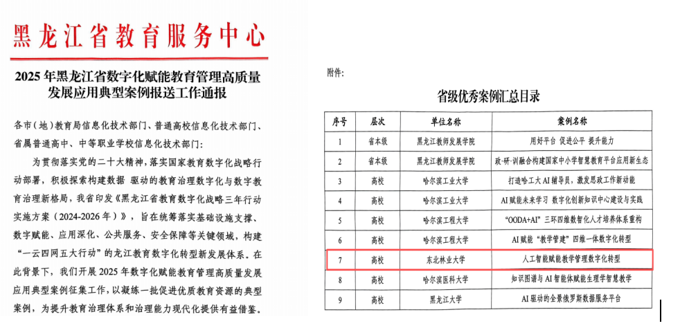 黑龙江省教育厅和黑龙江省教育服务中心公布了2025年教育数字化领域的重要成果,我校由本科生院牵头的两项案例获得省级表彰,《生态文明智慧教学创新中心的建设与实践》入选 2025年黑龙江省“人工智能+高等教育”应用场景典型案例,《人工智能赋能教学管理数字化转型》入选2025年黑龙江省数字化赋能教育管理高质量发展应用典型案例。