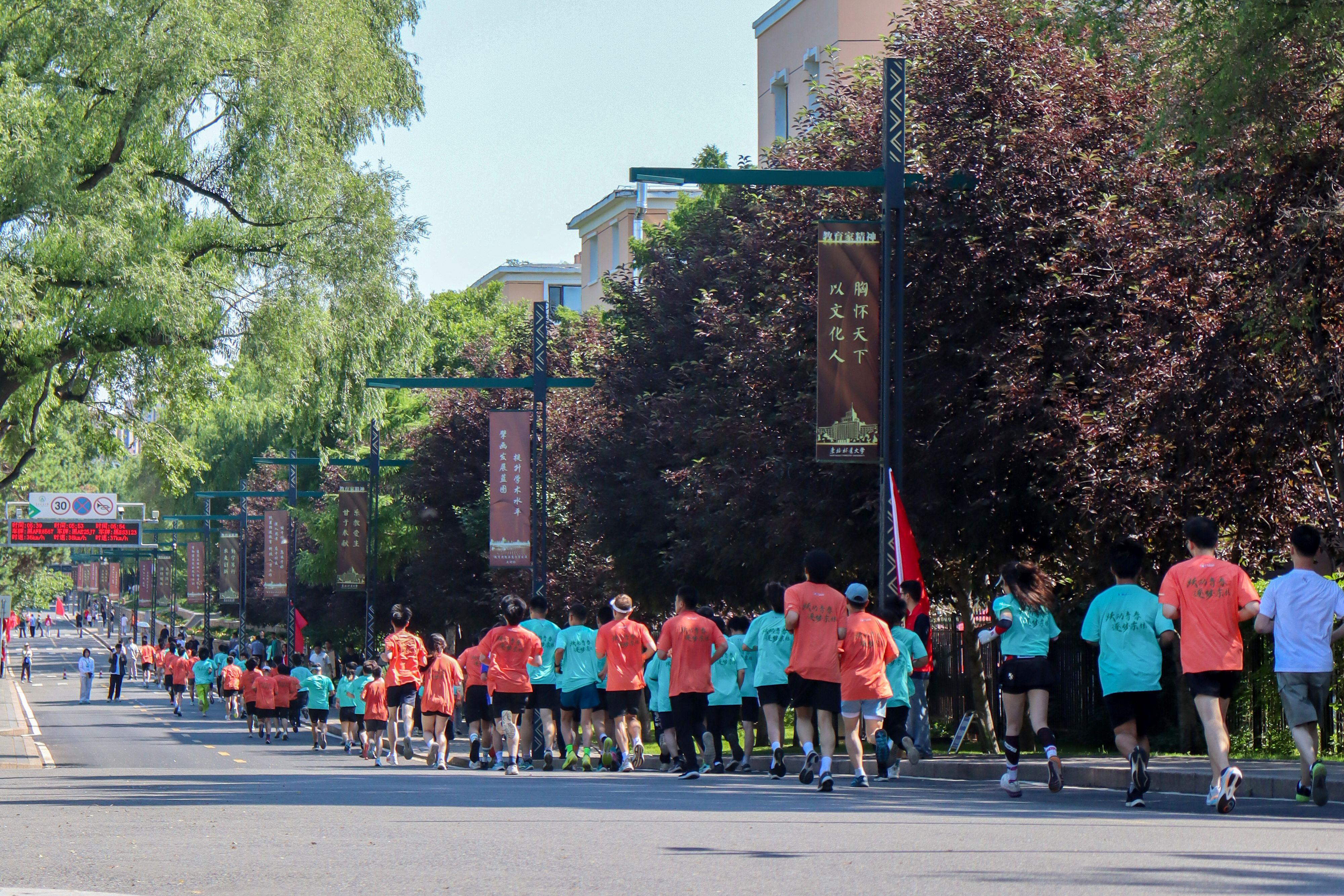 师生们或快或慢,或谈笑或加油打气,始终保持坚定的步伐,校园跑道瞬间成为了亮丽的风景线。