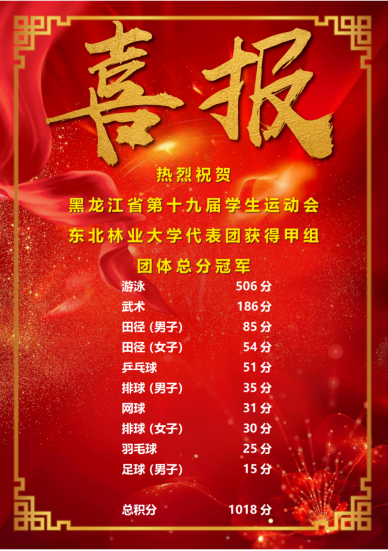 7月15日至25日,黑龙江省第十九届学生运动会在大庆市盛大举行。我校165名运动健儿怀揣着为校争光梦想,在篮球、足球、排球、乒乓球、羽毛球、网球、田径、游泳、武术九个项目中展开激烈角逐。经过十天激烈比拼,东林健儿凭借出色发挥和顽强拼搏,以多项冠军和数十枚奖牌的优异成绩,勇夺大学甲组团体总分第一名,在龙江高校体育的最高舞台上书写了属于东林的辉煌篇章。