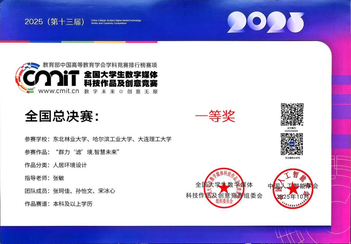 近日,由中国人工智能学会、全国大学生数字媒体科技作品及创意竞赛组委会主办的2025第十三届全国大学生数字媒体科技作品及创意竞赛全国总决赛在哈尔滨工业大学圆满落幕。由我校园林学院学子张柯佳、哈尔滨工业大学孙怡文、大连理工大学宋冰心共同参赛的团队作品《群力“滤”境·智慧未来》从全国17万件作品中脱颖而出,斩获全国总决赛一等奖,指导教师张敏荣获“优秀指导教师”荣誉称号。