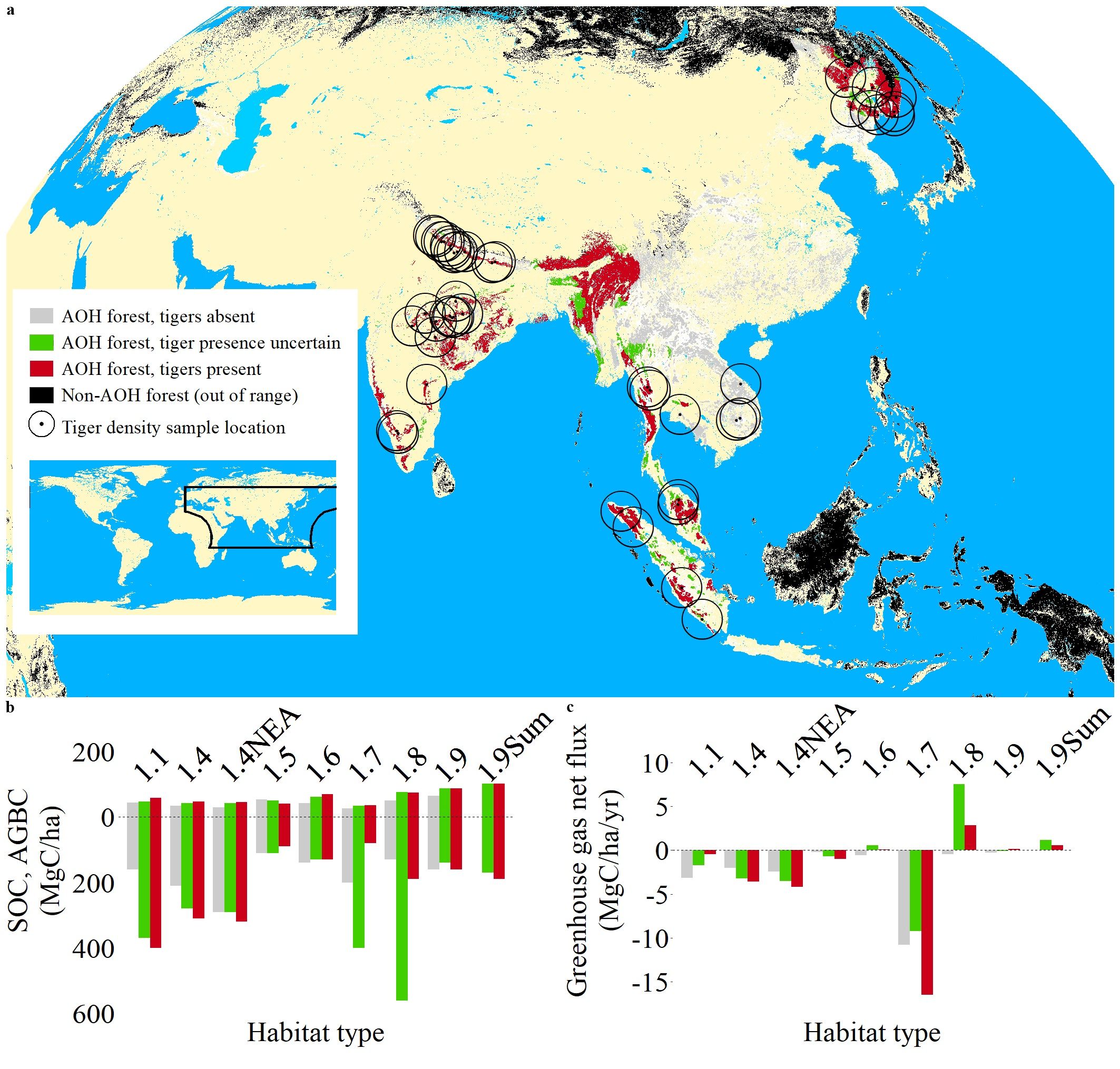 图1全球虎栖息地类型和地区的存在状况及碳指标(土壤有机碳、地上生物量和森林净碳通量)