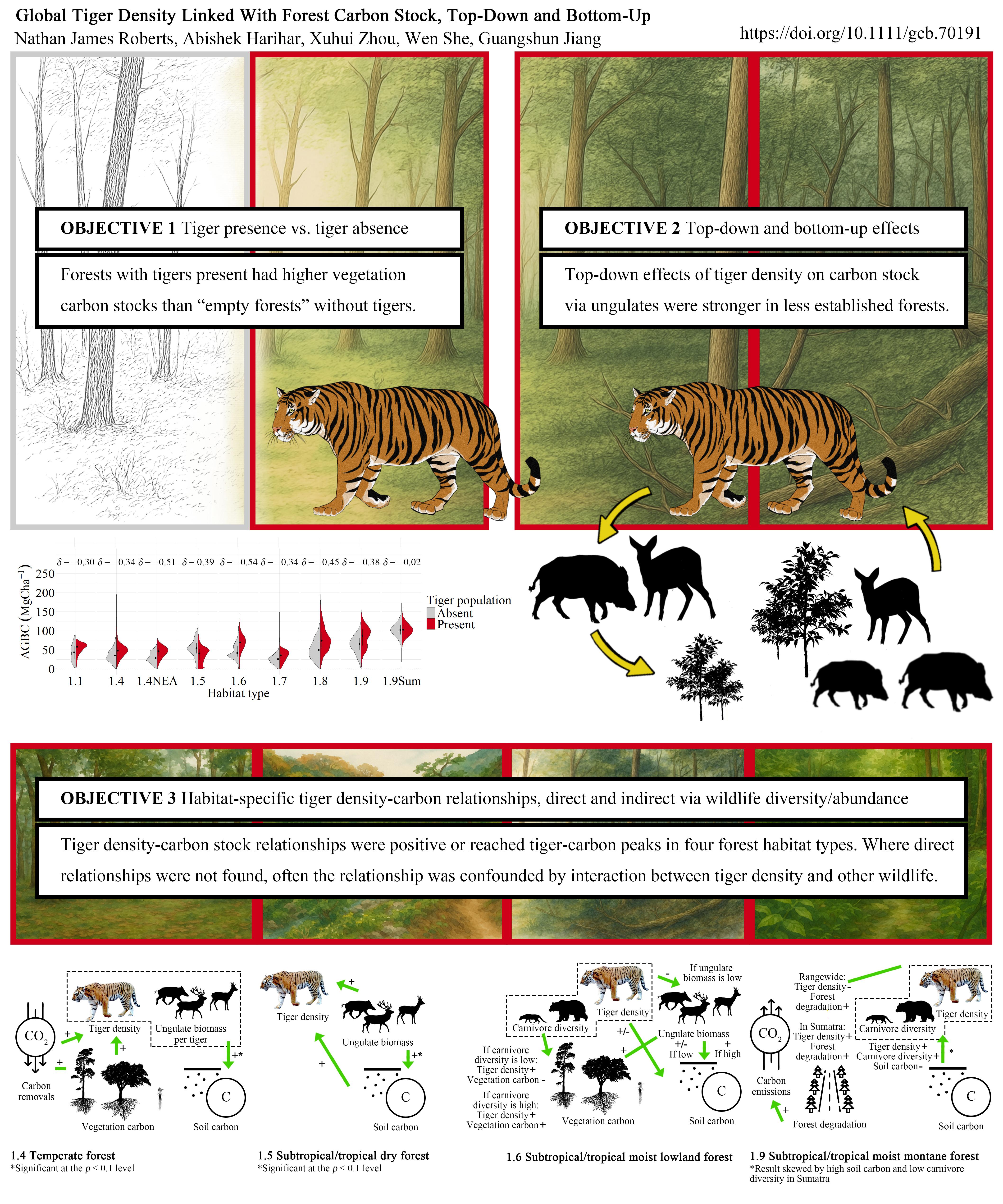 原文链接: Roberts, N.J., Harihar, A., Zhou, X., She, W. and Jiang, G. (2025), Global Tiger Density Linked With Forest Carbon Stock, Top-Down and Bottom-Up. Glob Change Biol, 31: e70191. https://doi.org/10.1111/gcb.70191.