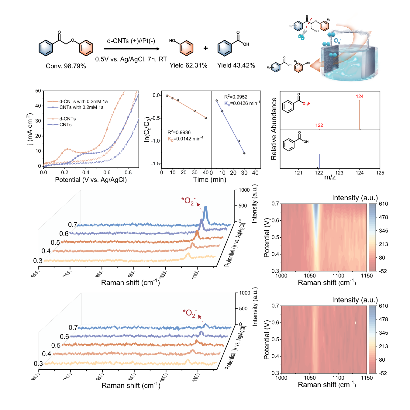该研究采用了富缺陷的碳纳米管(d-CNTs)作为电催化剂。通过同位素标记、原位拉曼光谱表征、理论计算等手段证明原位OER过程中的氧气脱附被抑制,从而保留了活性氧物种(O2−),其与木质素烯醇中间体结合,促进木质素Cα–Cβ键裂解。无外源氧化剂的情况下,在仅为0.5 V vs. Ag/AgCl电位时,木质素模型化合物2-苯氧基苯乙酮转化率为98.8%,产物苯酚、苯甲酸的得率分别为62.31%和43.42%。此外,经预氧化的杨木木质,在该电催化体系下解聚产生了高达12.41 wt%的芳香单体。该研究为碱性条件下电催化木质素解聚过程中Cα–Cβ键断裂的机制提供了新的见解。