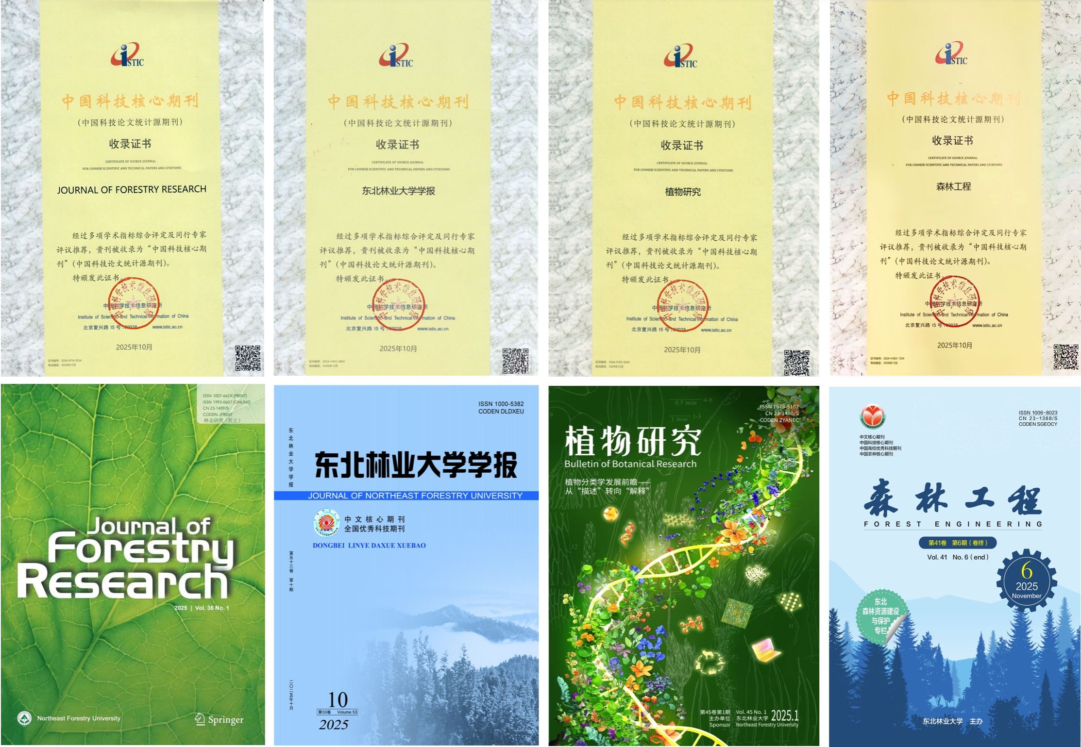 10月30日,《2025中国科技期刊引证报告(核心版)》在北京发布,我校主办期刊《林业研究(英文)》(Journal of Forestry Research)《东北林业大学学报》《植物研究》《森林工程》入选《2025年版中国科技期刊引证报告(核心版)自然科学卷》。其中,《林业研究(英文)》分别入编报告中“2025中国科技期刊相关指标”(中国科技期刊的国际影响力)“进入总被引频次本学科领域排名前1/4(Q1区)的44种期刊”(为林学学科唯一入选期刊)和“进入影响因子本学科领域排名前1/4(Q1区)的172种期刊”(仅2种林学学科期刊入选,JFR排名靠前)。