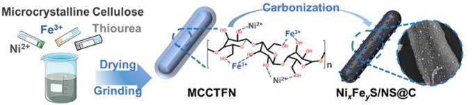 该研究团队提出以微晶纤维素衍生碳为载体,成功制备出氮硫共掺杂微晶纤维素衍生碳负载镍基硫化物纳米颗粒(NixFeyS/NS@C)催化剂。其中,微晶纤维素表面的丰富的羟基(–OH)可与金属前驱体相互作用,实现金属活性组分的均匀负载,还能抑制煅烧过程中金属纳米颗粒的团聚,保障金属活性组分的分散性。