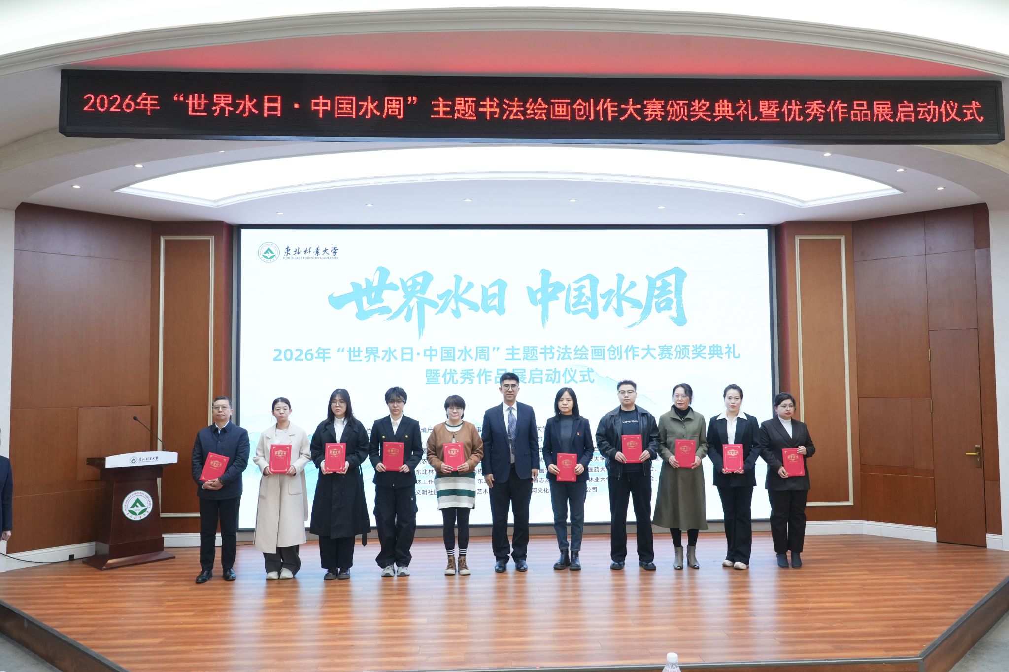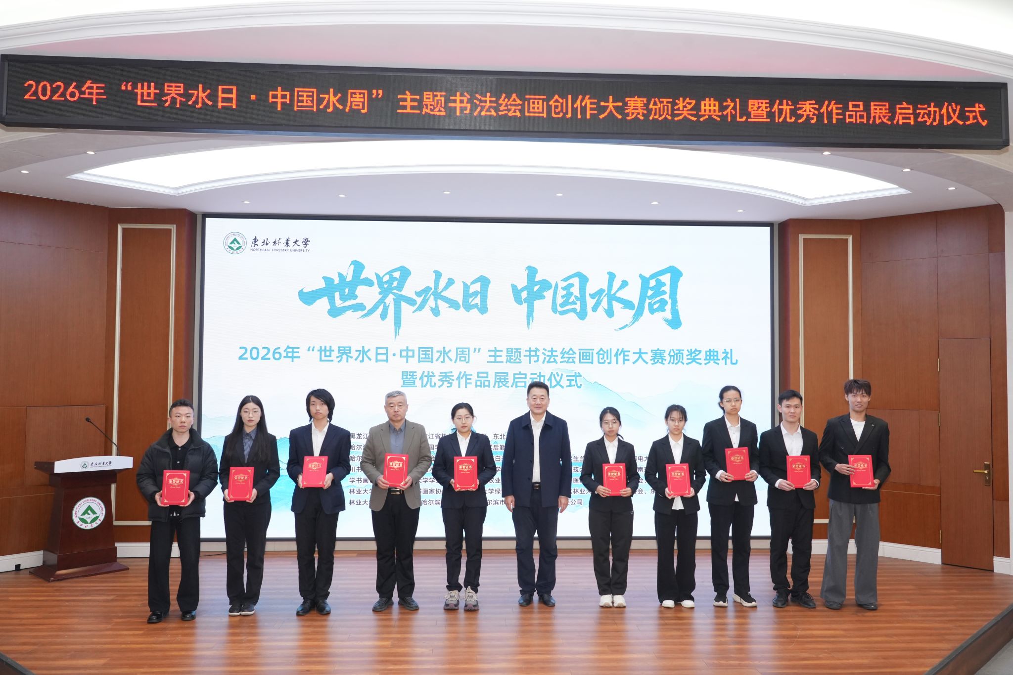 在第34届“世界水日”和第39届“中国水周”来临之际,3月26日,由黑龙江省生态环境厅、省机关事务管理局与我校联合主办的“感江河大爱,书岁月情怀”主题书画大赛优秀作品展启动仪式暨颁奖典礼在我校举行。黑龙江省机关事务管理局党组成员、副局长王鹏,黑龙江省生态环境厅二级巡视员朱燕宏,我校党委副书记翟雪峰出席活动。
