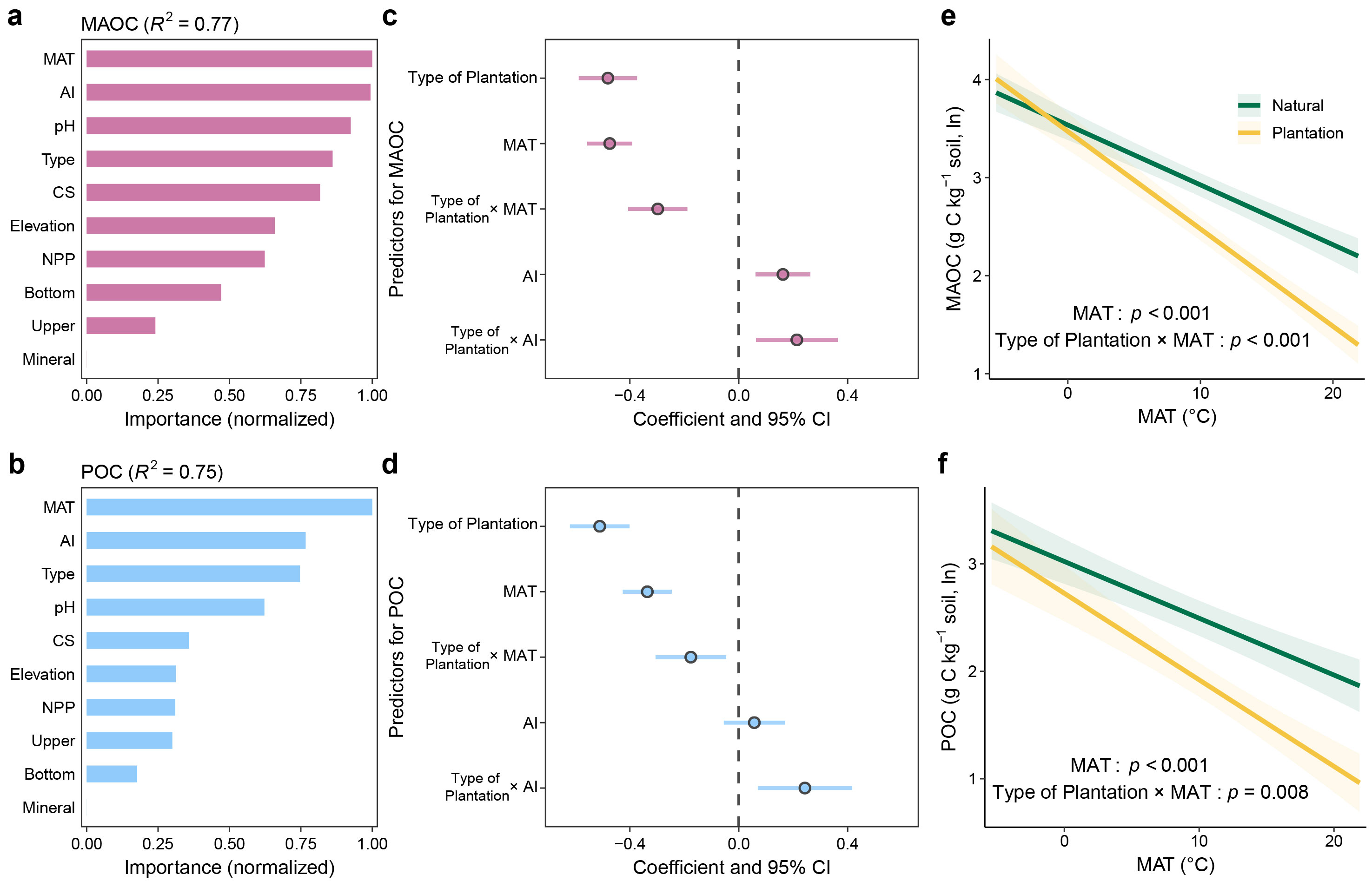 研究基于全国范围的采样(248个样点)和文献数据整合(817个样点),系统评估了我国森林表层土壤中矿物结合有机碳(MAOC)和颗粒有机碳(POC)的储量及潜在增长量。结果显示,天然林土壤MAOC和POC含量分别为人工林的2.3倍和2.5倍。混合线性模型分析表明,人工林土壤MAOC和POC对气候变暖及干旱的脆弱性高于天然林。