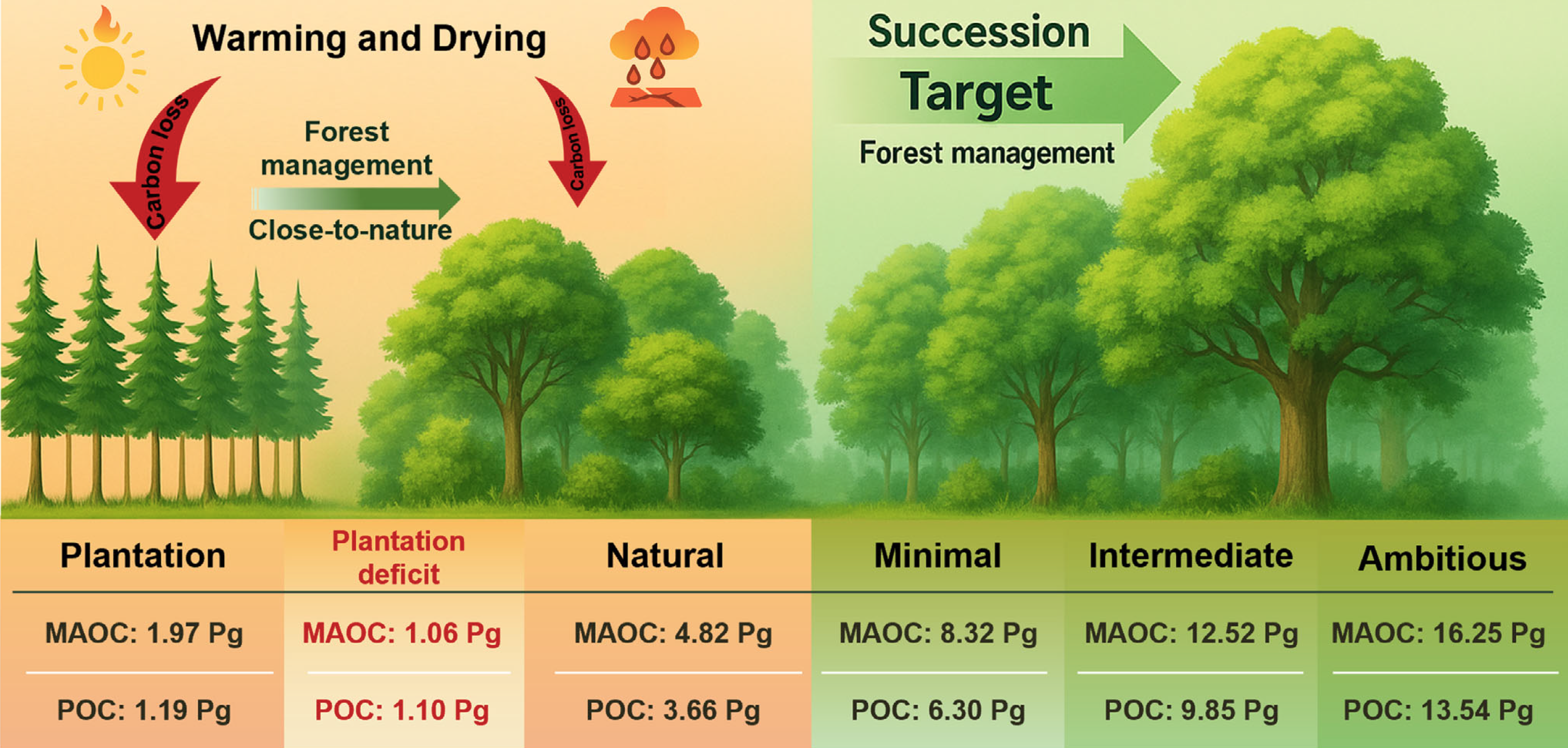 随机森林模型的评估结果显示,我国天然林土壤MAOC和POC储量分别为4.82 Pg(Pg单位为10亿吨)和3.66 Pg,而人工林土壤MAOC和POC储量则为1.97 Pg和1.18Pg。若将人工林土壤碳固持能力提升至与天然林相同水平,我国人工林土壤可额外固存约2.17 Pg碳。相较于天然林,人工林土壤碳储量缺口相当于我国陆地生态系统近10年的累计碳汇。进一步的整合分析表明,对人工林实施近自然改造约15年,可将土壤碳储量提升43 %。因此,近自然改造是提升现有人工林土壤固碳能力的关键且高效的措施。
