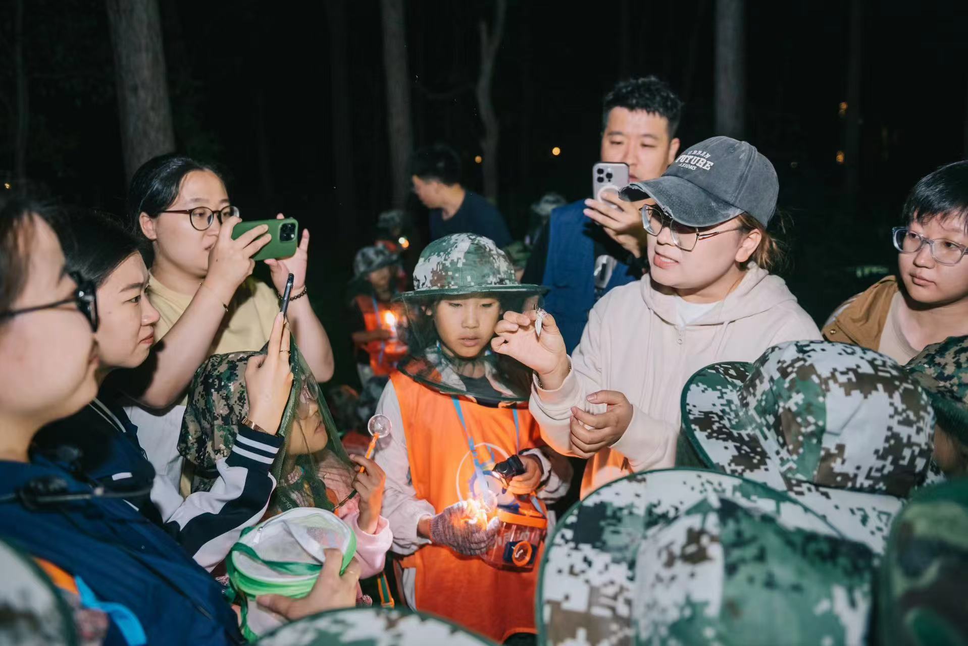 “老师,你看,这是蝴蝶还是蛾子?”“老师,你听,这是什么昆虫的叫声?”……只见孩子们身穿荧光马甲,头戴防虫帽和头灯,身背昆虫盒,正在与老师们一起穿梭在东北林业大学林场中,夜探森林。
