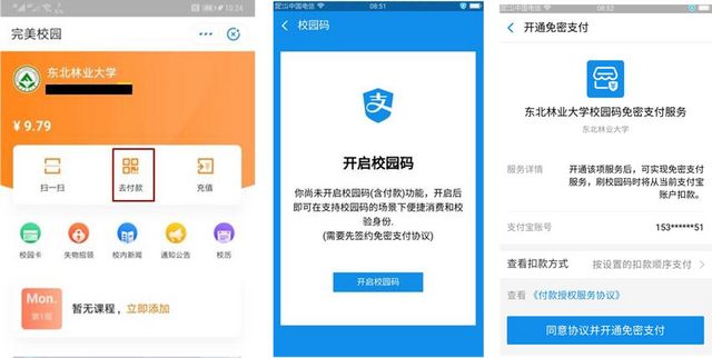 目前,东北林业大学各食堂、商超等多个消费地点已开启支付宝支付功能(微信、银联支付功能将陆续开通),开通及使用方法具体步骤如下: