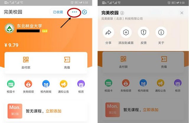 为使用便捷,建议将“完美校园”小程序和“付款码”添加到桌面,具体操作如下图。由于“付款码”无法用图片展示,下面以文字形式描述。点击“去付款”进入付款页面,点击右上角按钮选择“添加到桌面”即可。